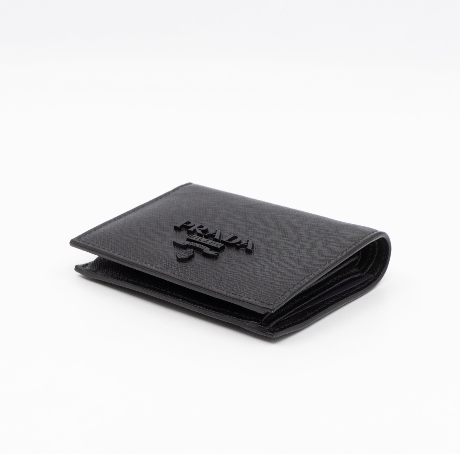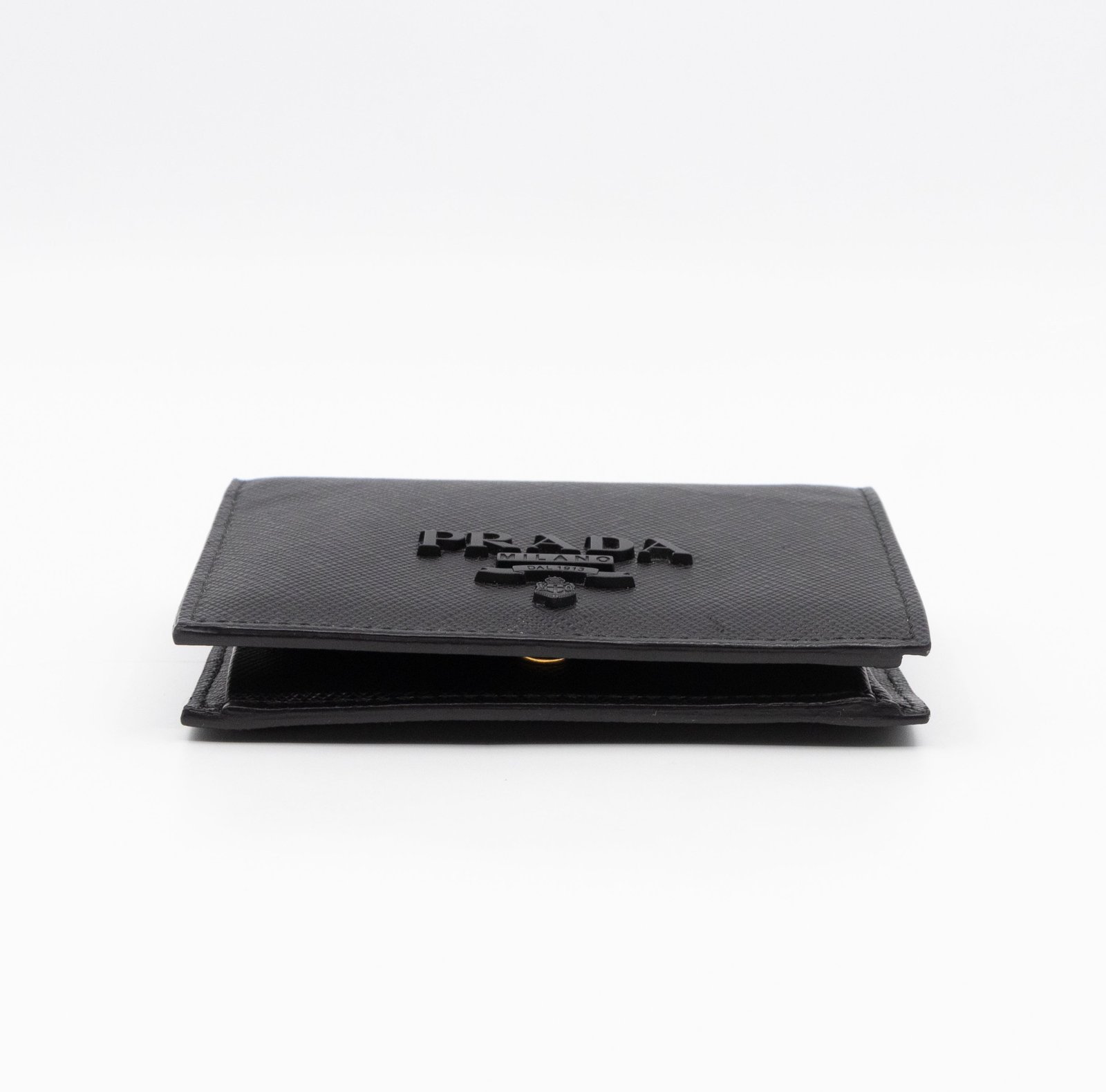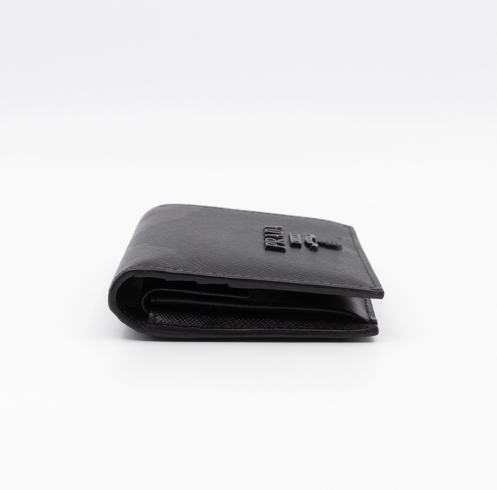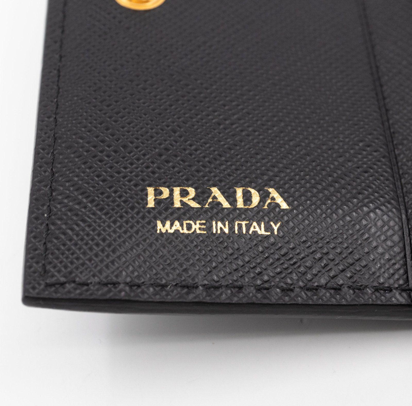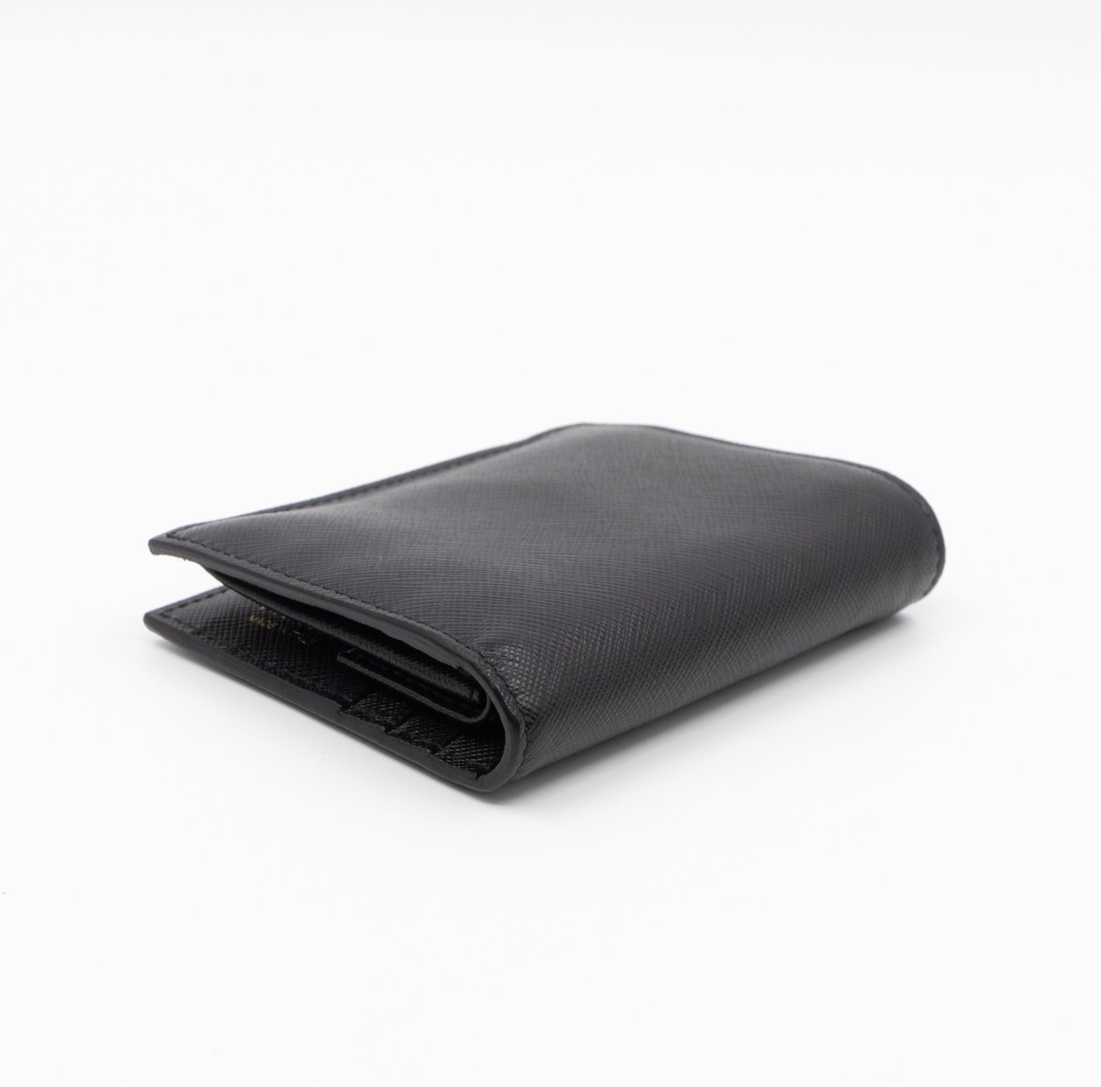 A Bifold Wallet from Prada. This everyday accessory is made with black saffiano shine leather and gold-tone hardware. Opens to matching black leather with card slots, patch pocket, and a small interior pocket with snap button perfect for organizing coins or small items, providing both style and practicality. The retail price is $495.