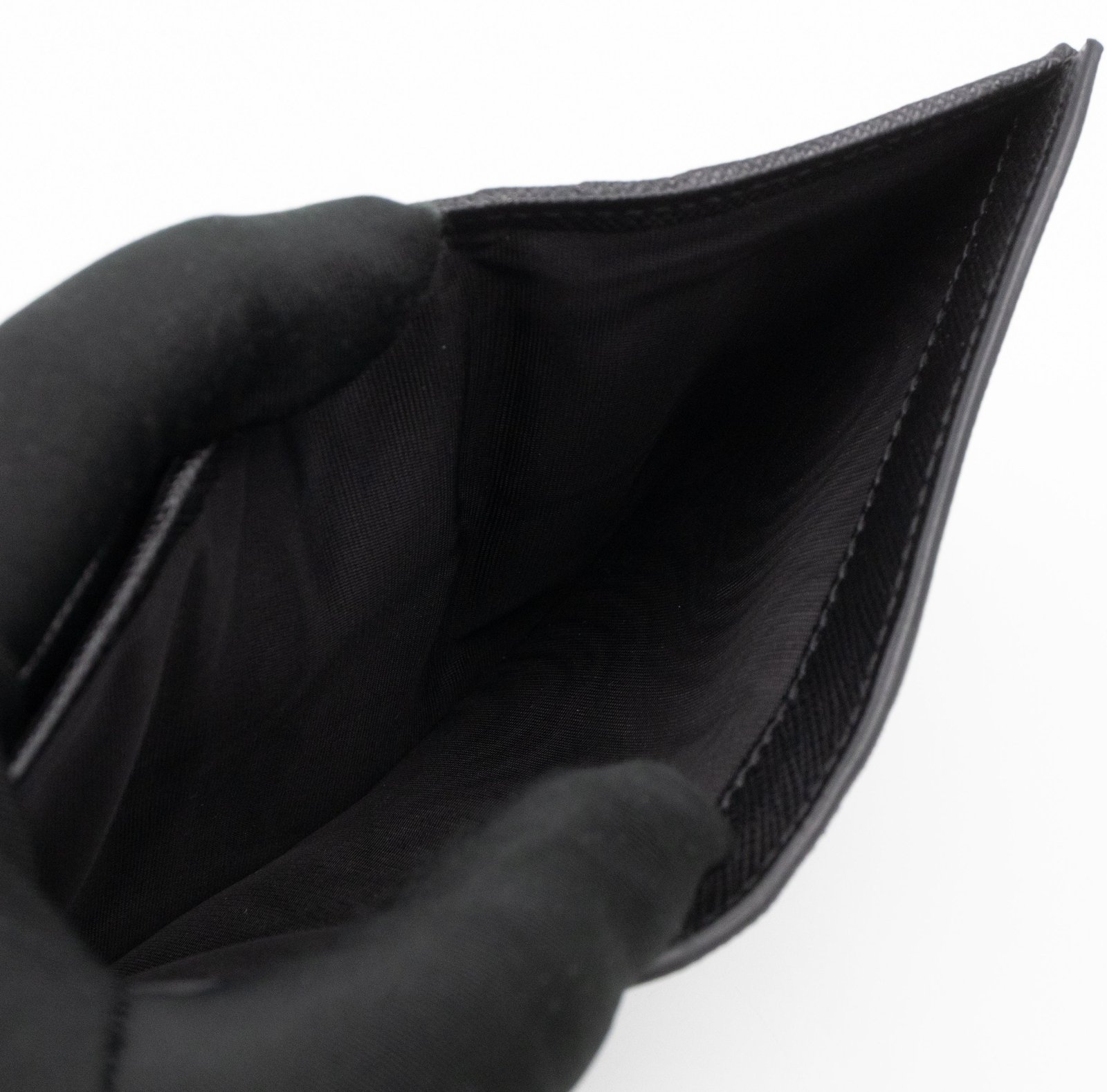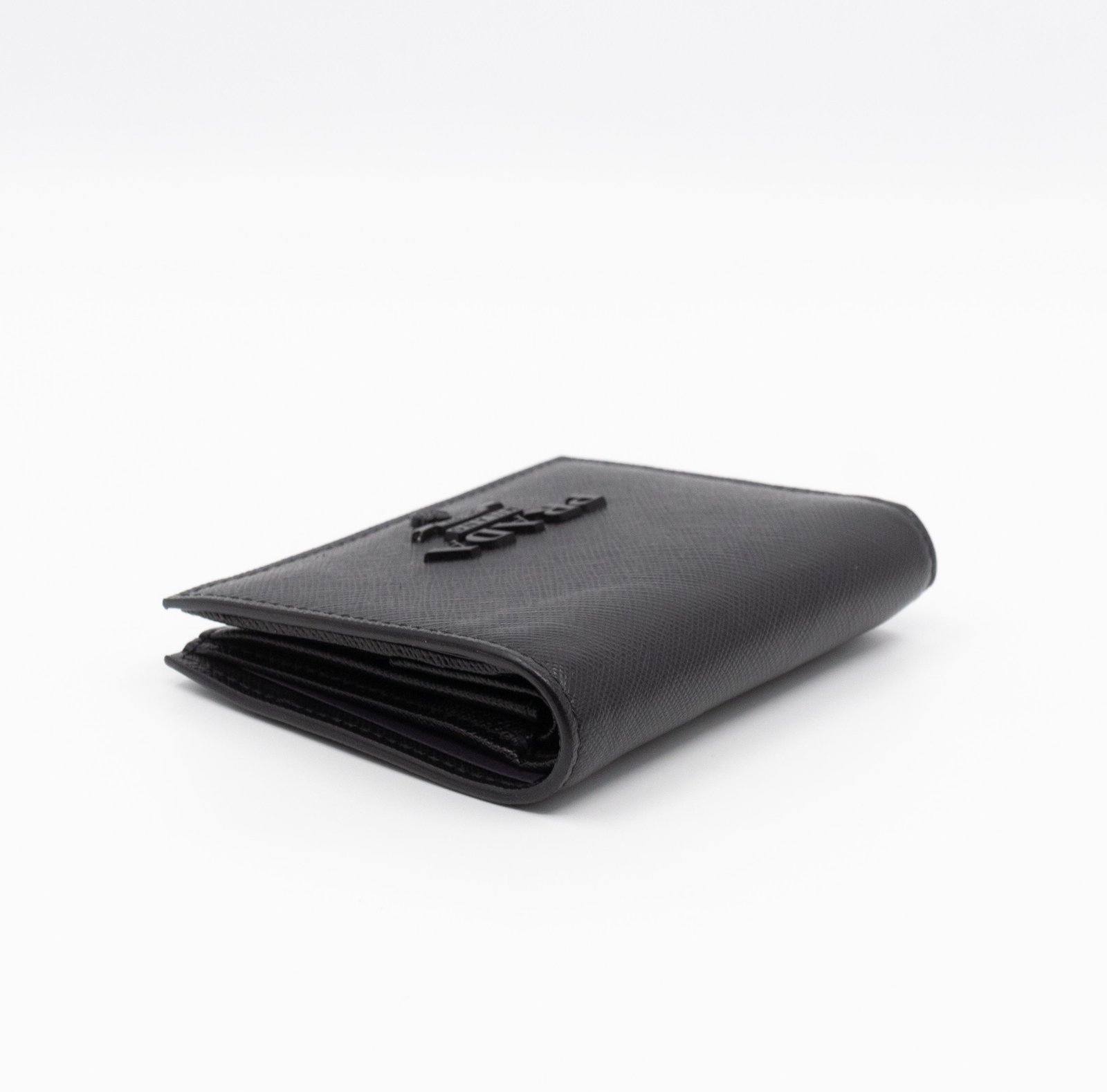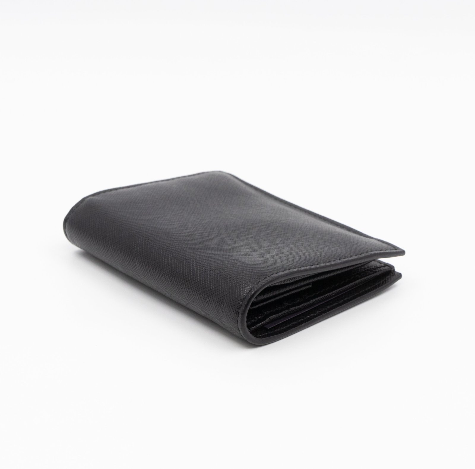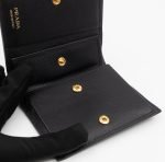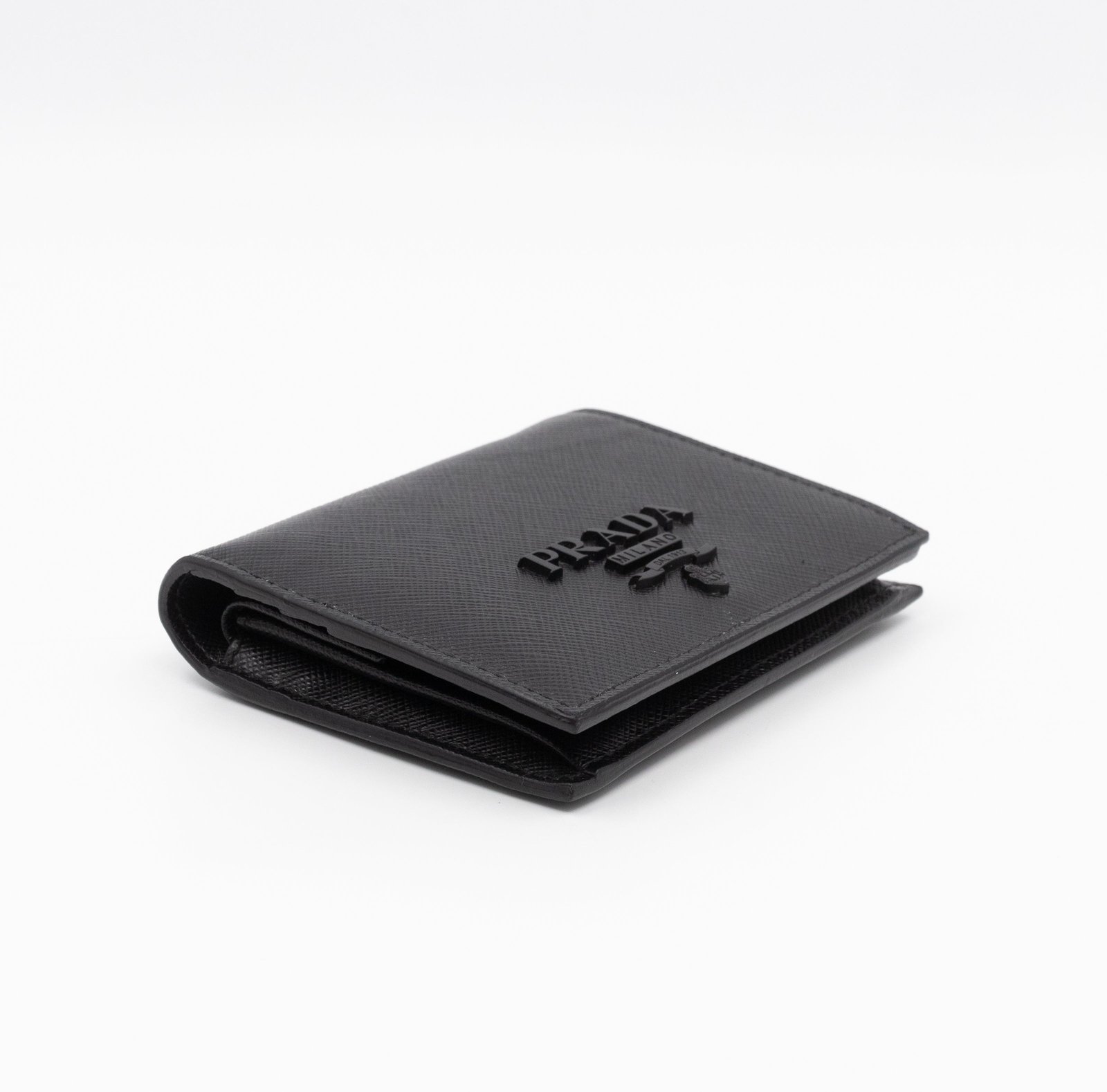 A Bifold Wallet from Prada. This everyday accessory is made with black saffiano shine leather and gold-tone hardware. Opens to matching black leather with card slots, patch pocket, and a small interior pocket with snap button perfect for organizing coins or small items, providing both style and practicality. The retail price is $495.