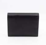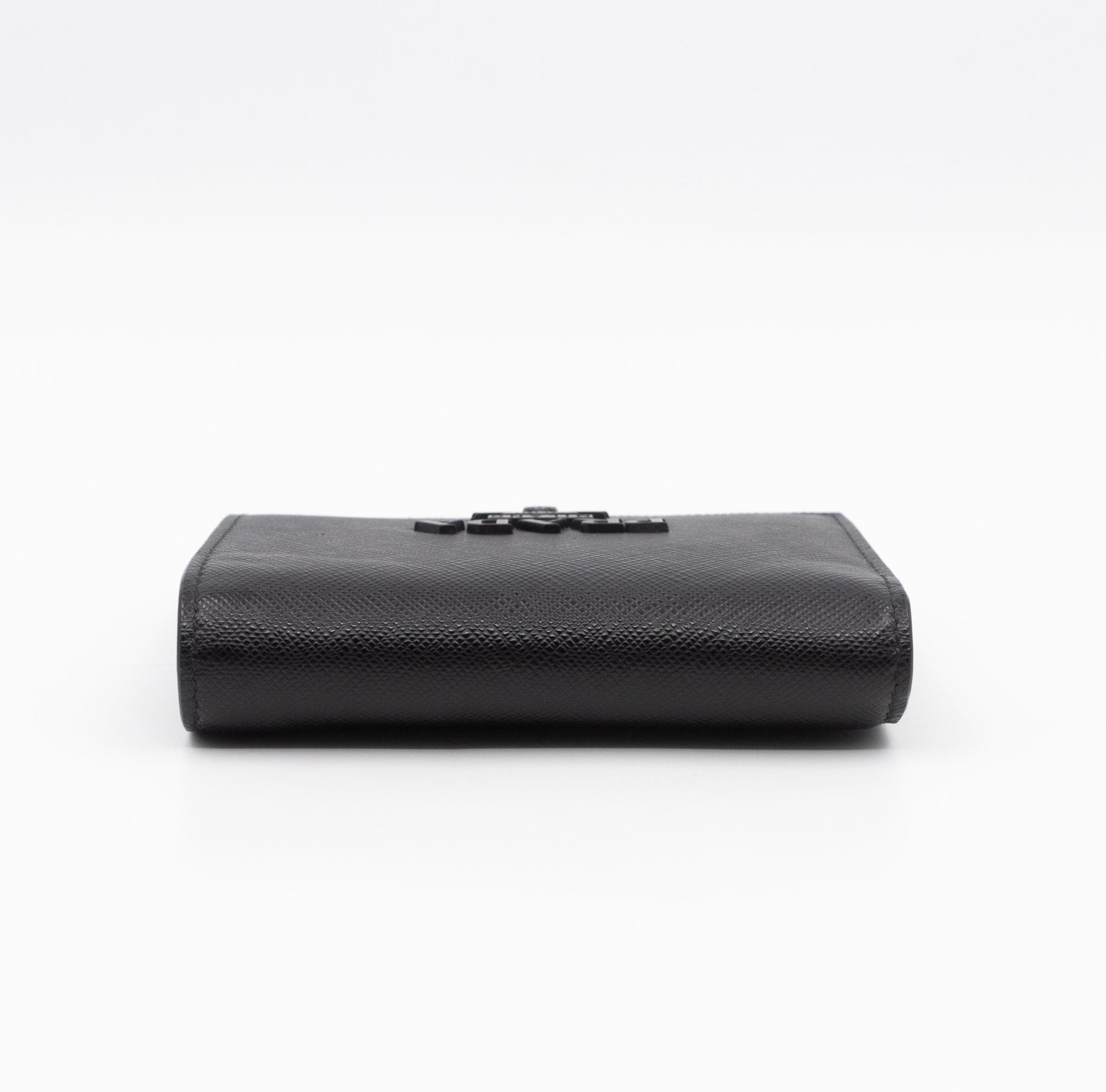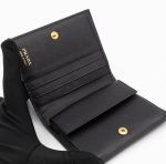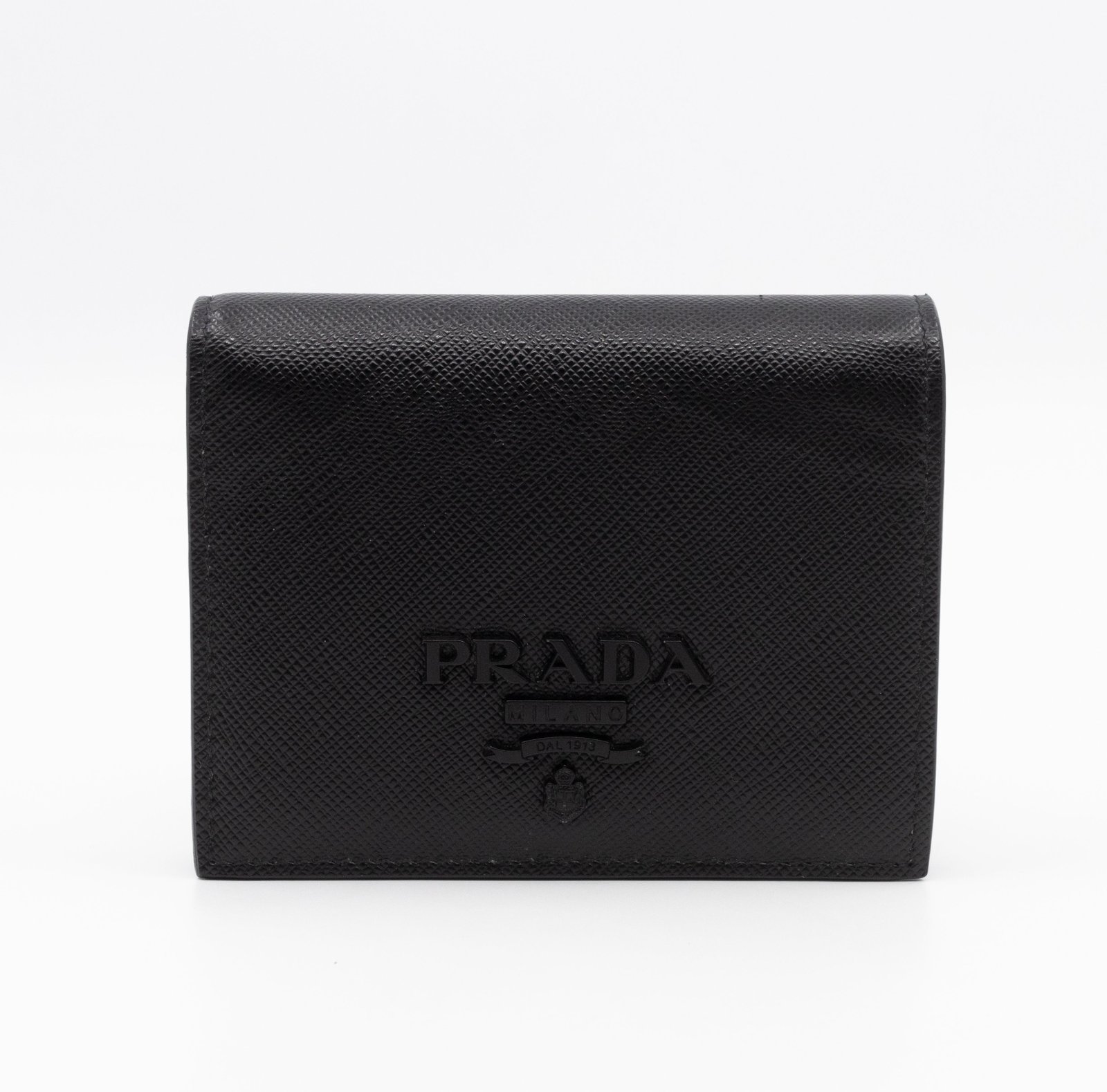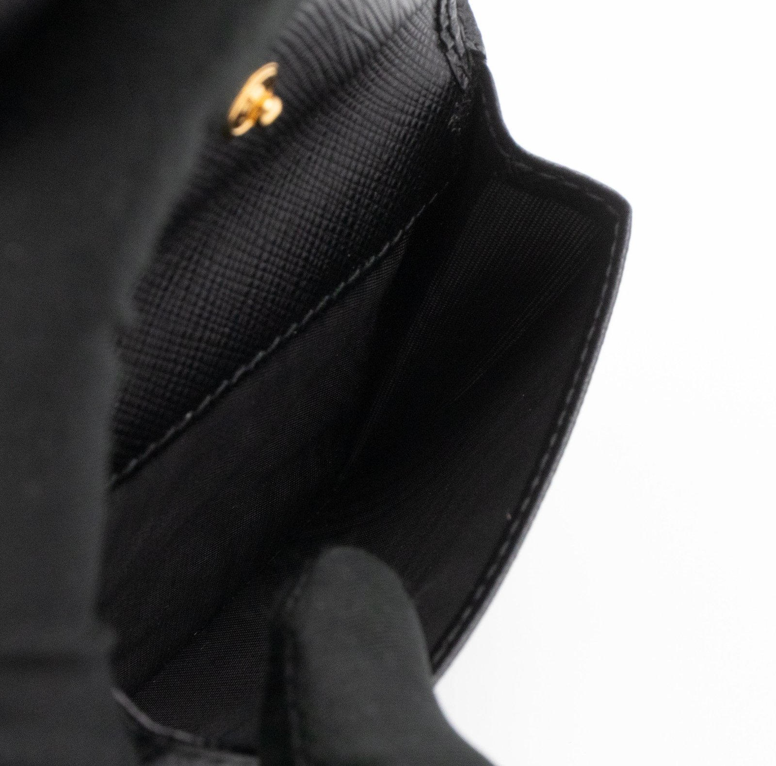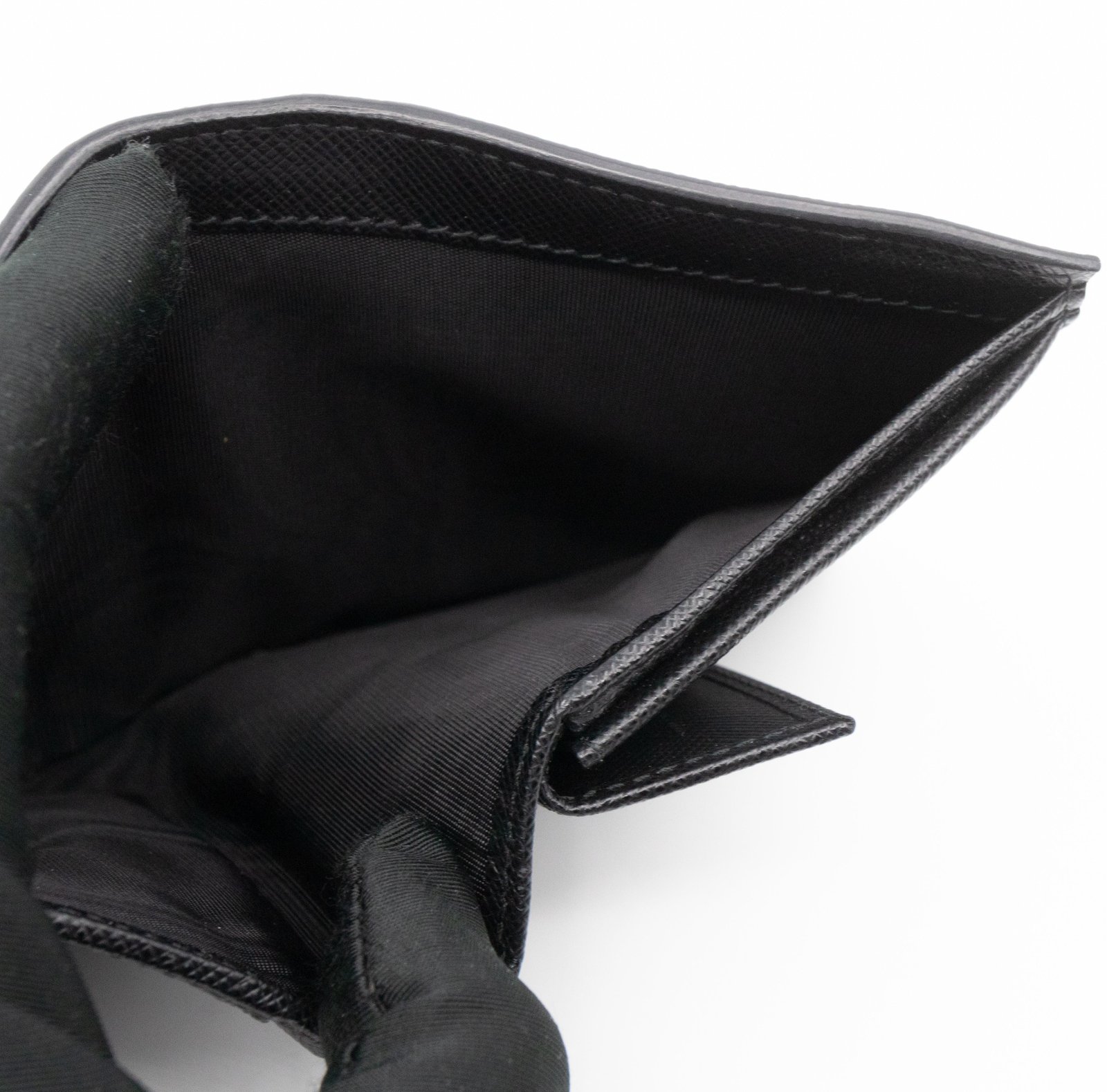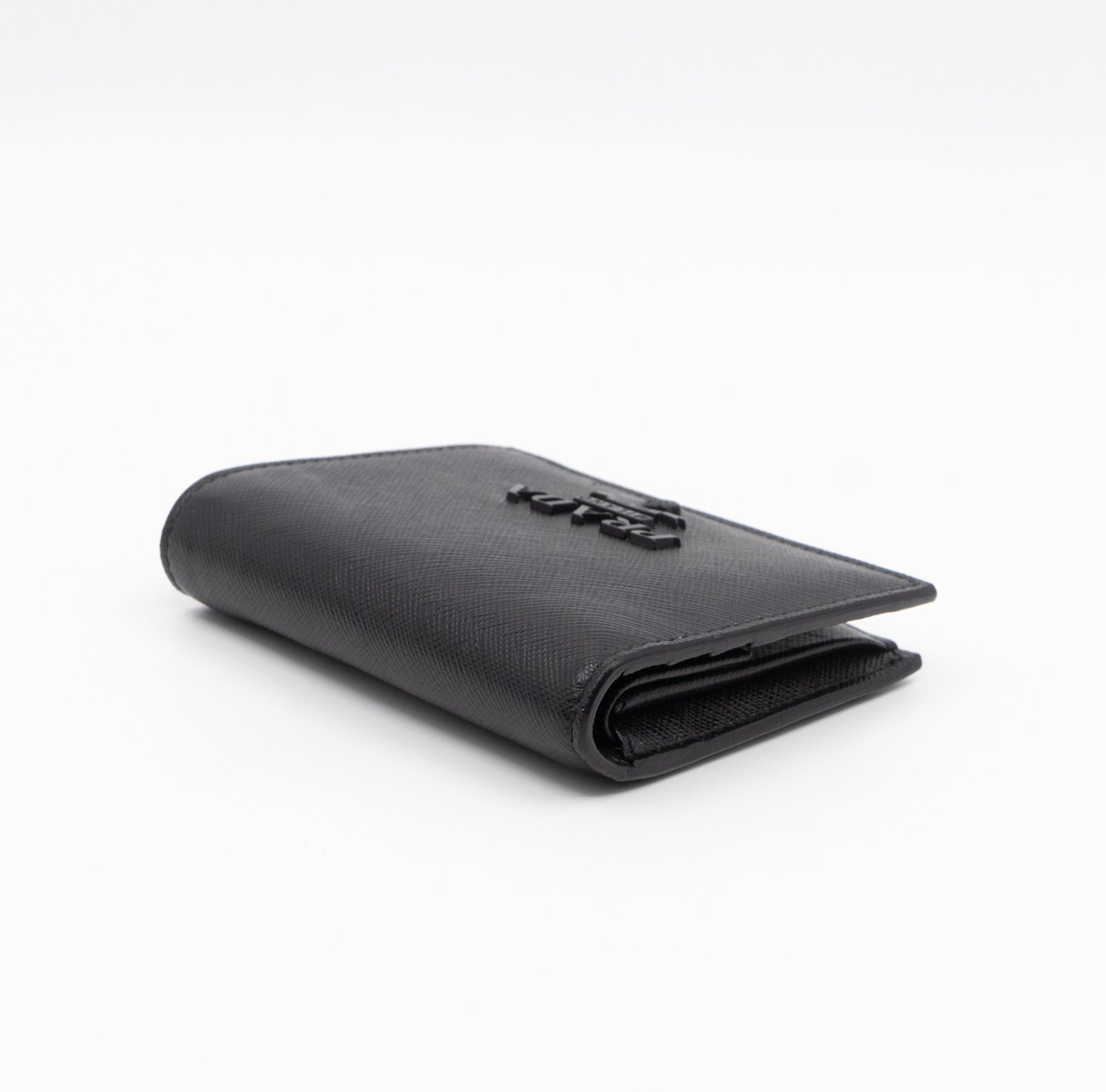 A Bifold Wallet from Prada. This everyday accessory is made with black saffiano shine leather and gold-tone hardware. Opens to matching black leather with card slots, patch pocket, and a small interior pocket with snap button perfect for organizing coins or small items, providing both style and practicality. The retail price is $495.