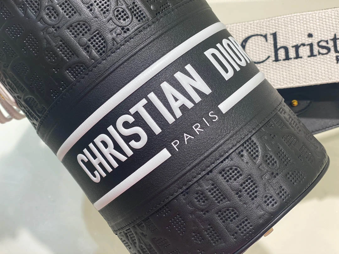 Black Cowhide Hollow Oblique Printed Bucket Bag Size 22cmx16cm