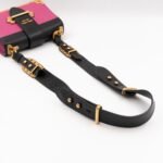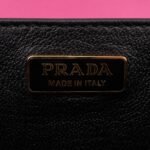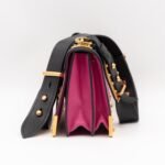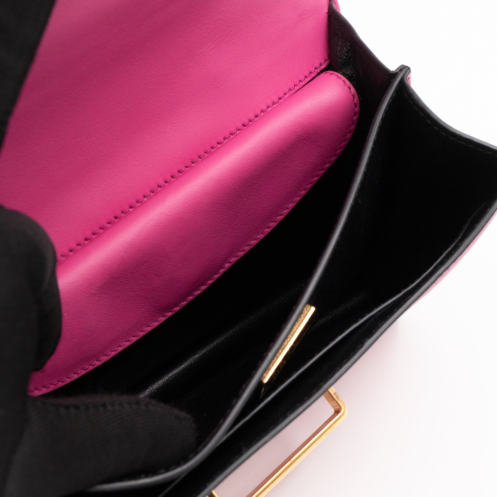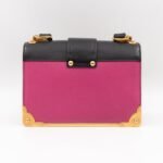 This elegant Cahier bag from Prada is a classic beauty. Made with pink leather featuring the Cahier style metal corners and details in aged gold-tone metal. On the front a large black leather flap which opens to an interior with a pocket. Features a wide adjustable leather strap for easy and stylish crossbody carrying. Retail price is €3200.