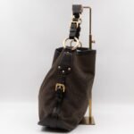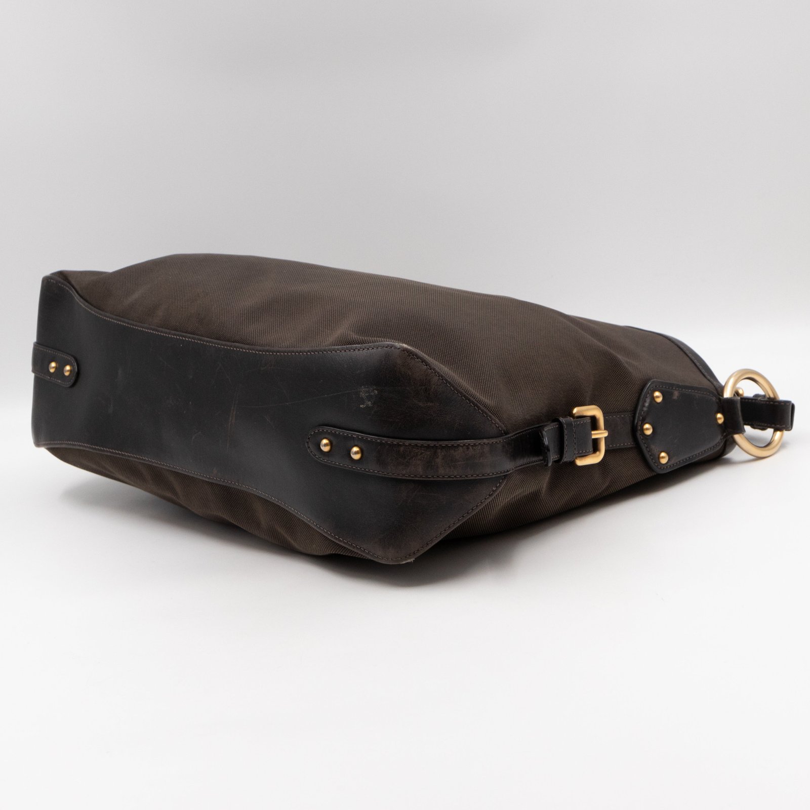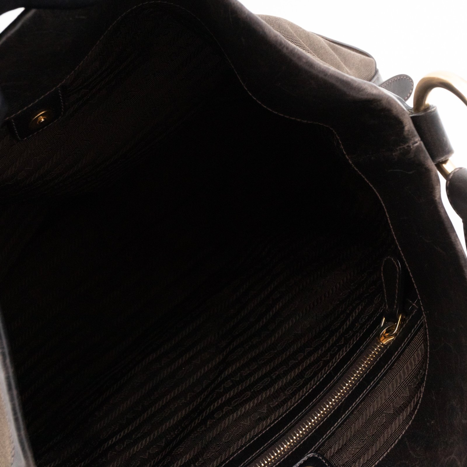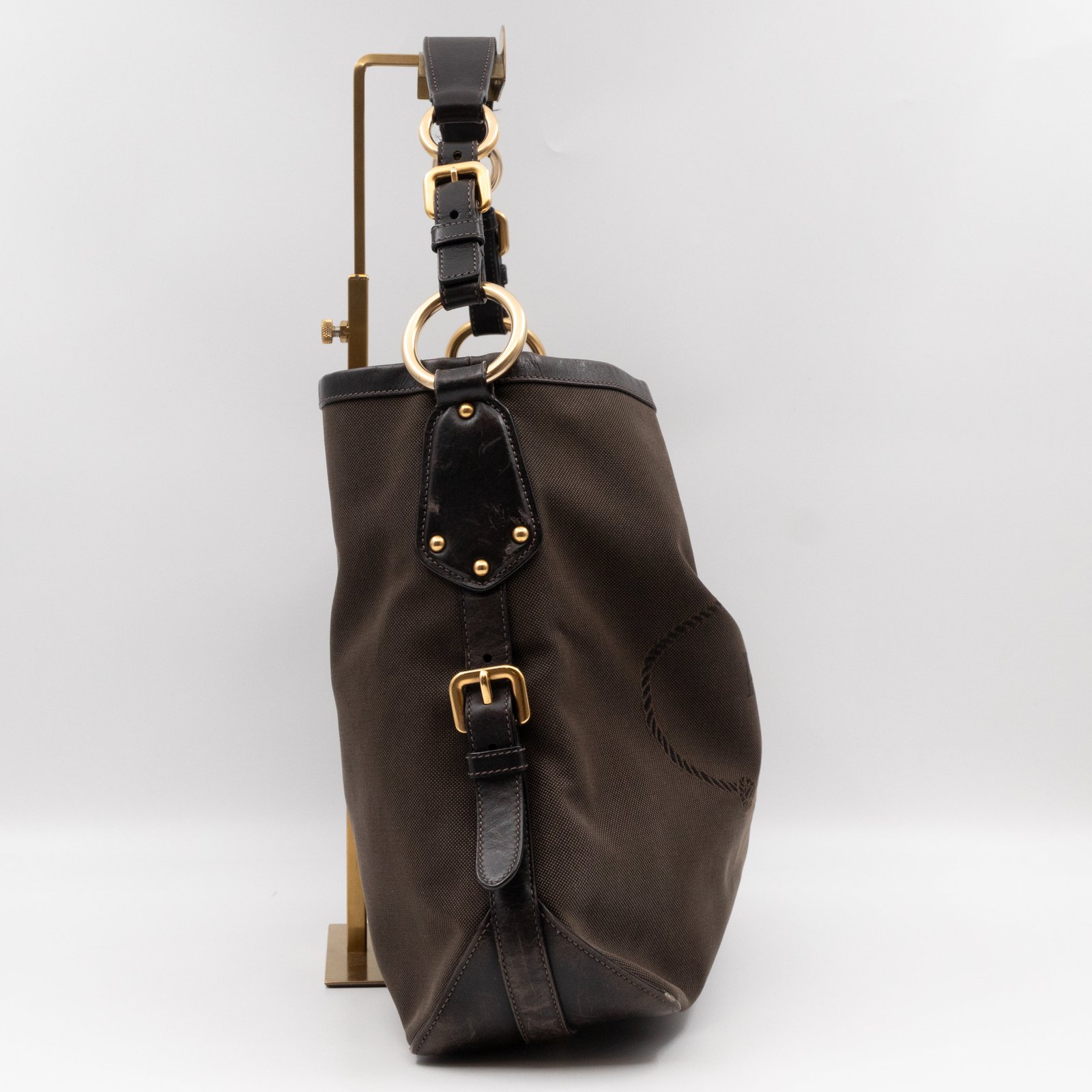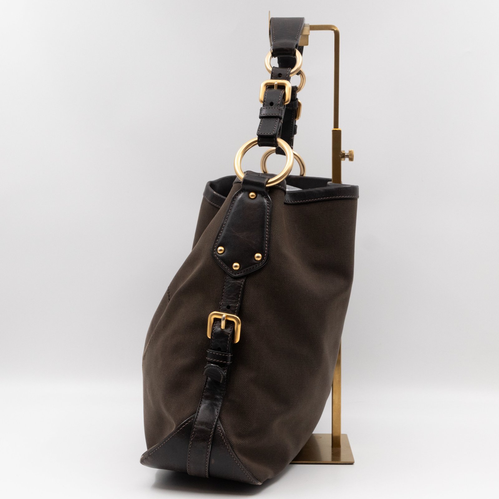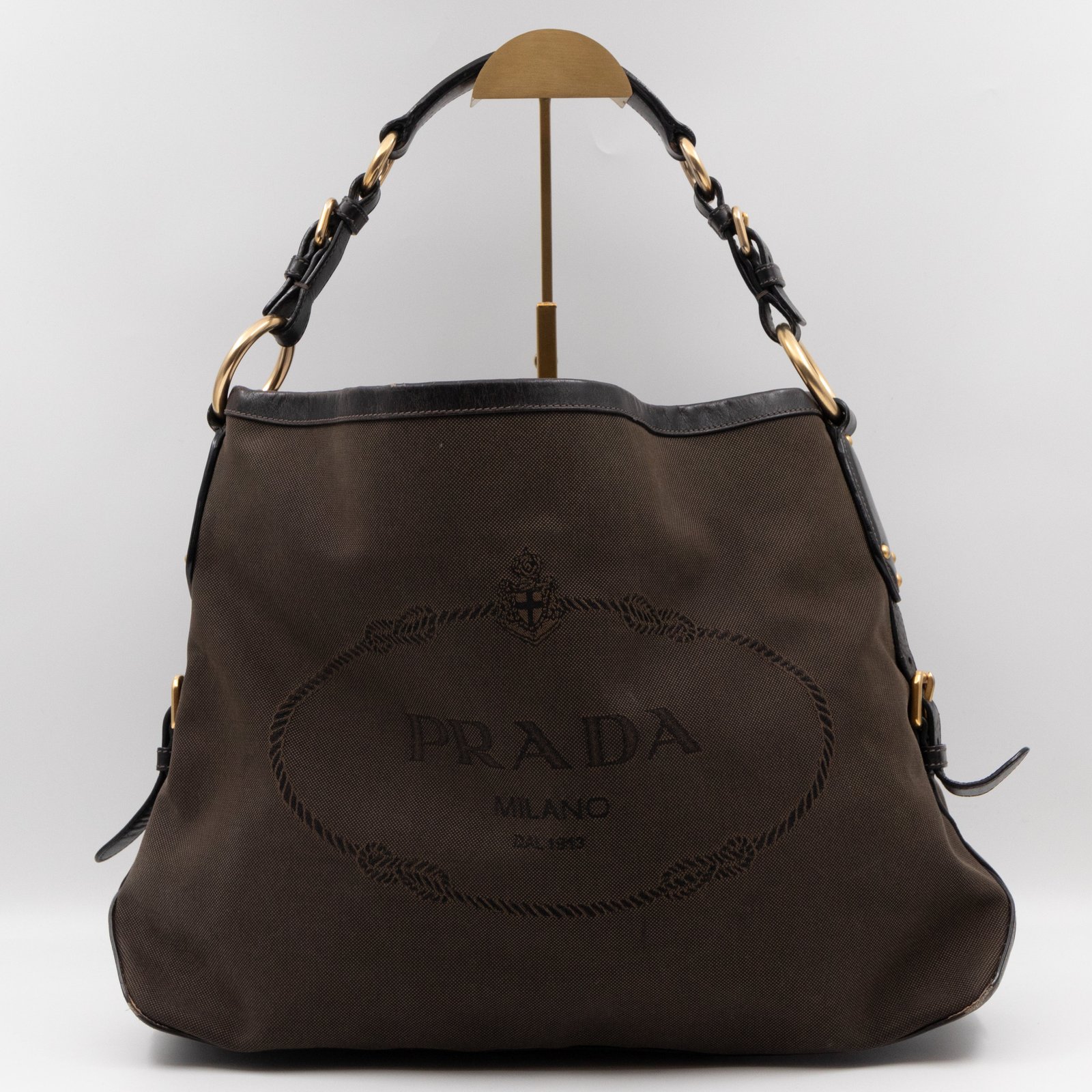 A Prada Canapa Hobo bag in brown canvas. Made in brown canvas and leather with gold-tone hardware. Convenient every day bag, nice size to carry your daily items. Single handle on large rings for comfortable shoulder carrying. Inside is a zipper pocket, the middle has a button closure.