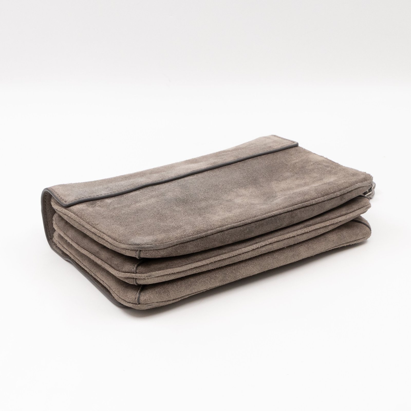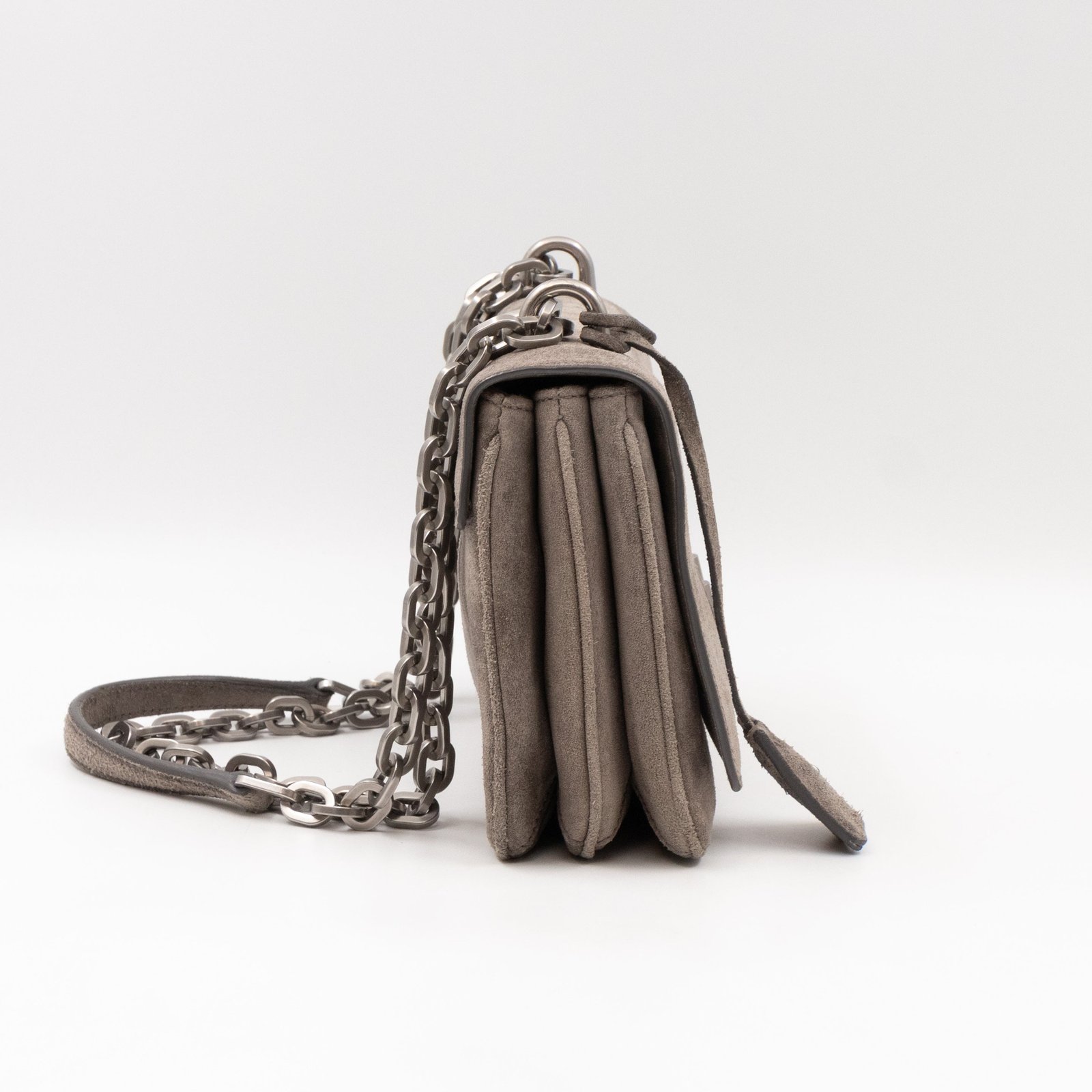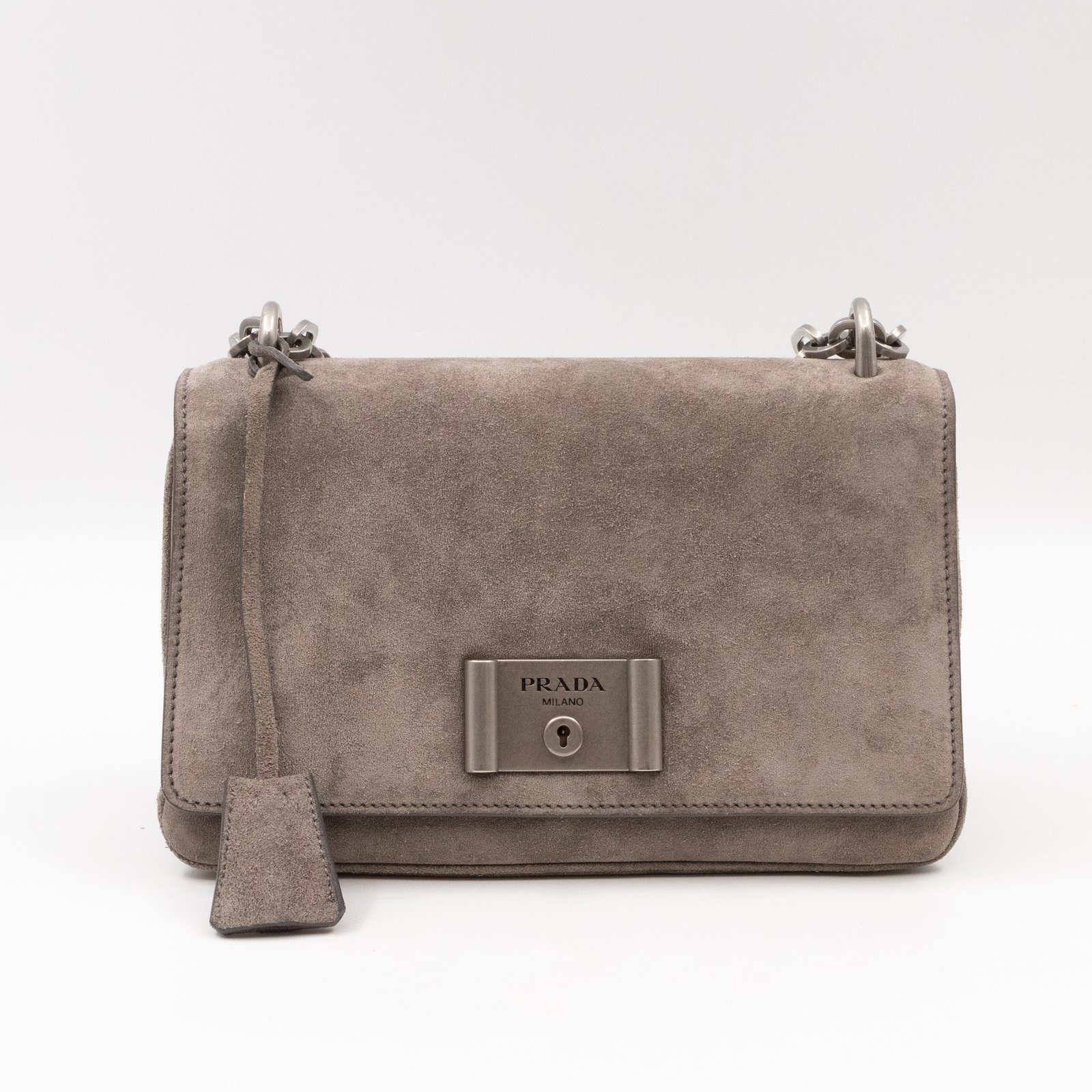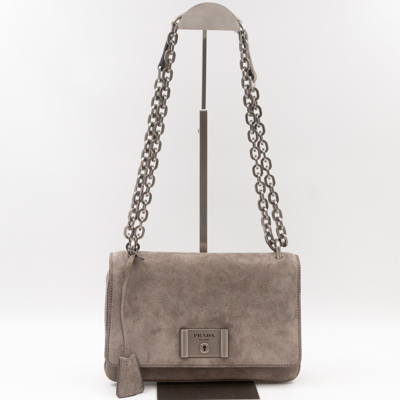 This is a Prada chain flap shoulder bag. Made in grey suede leather. The bag features a silver-tone metal flap closure and a chain link shoulder strap. The flap opens to three layers and all of which are brown smooth leather. Shoulder chain can be carried on the shoulder or crossbody.