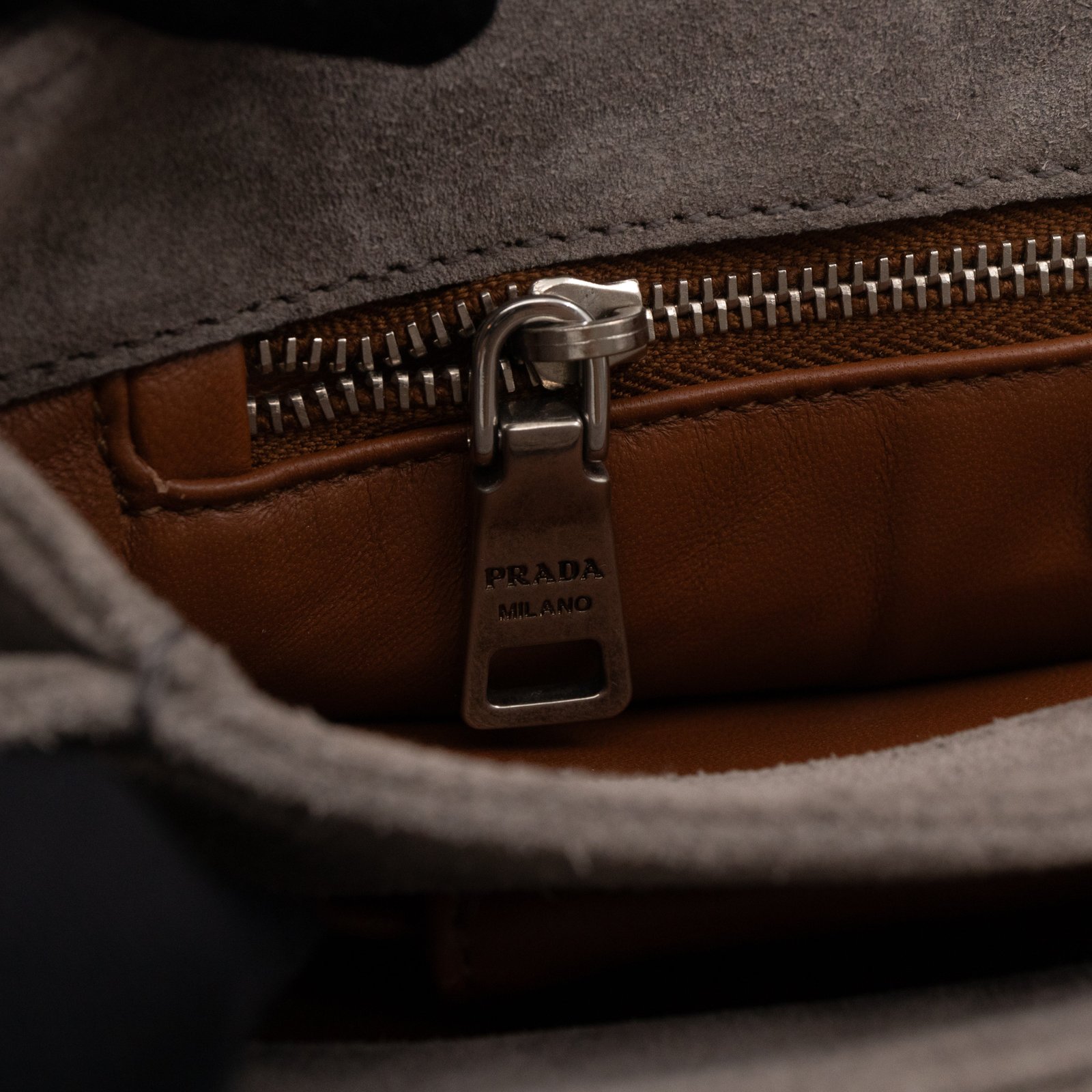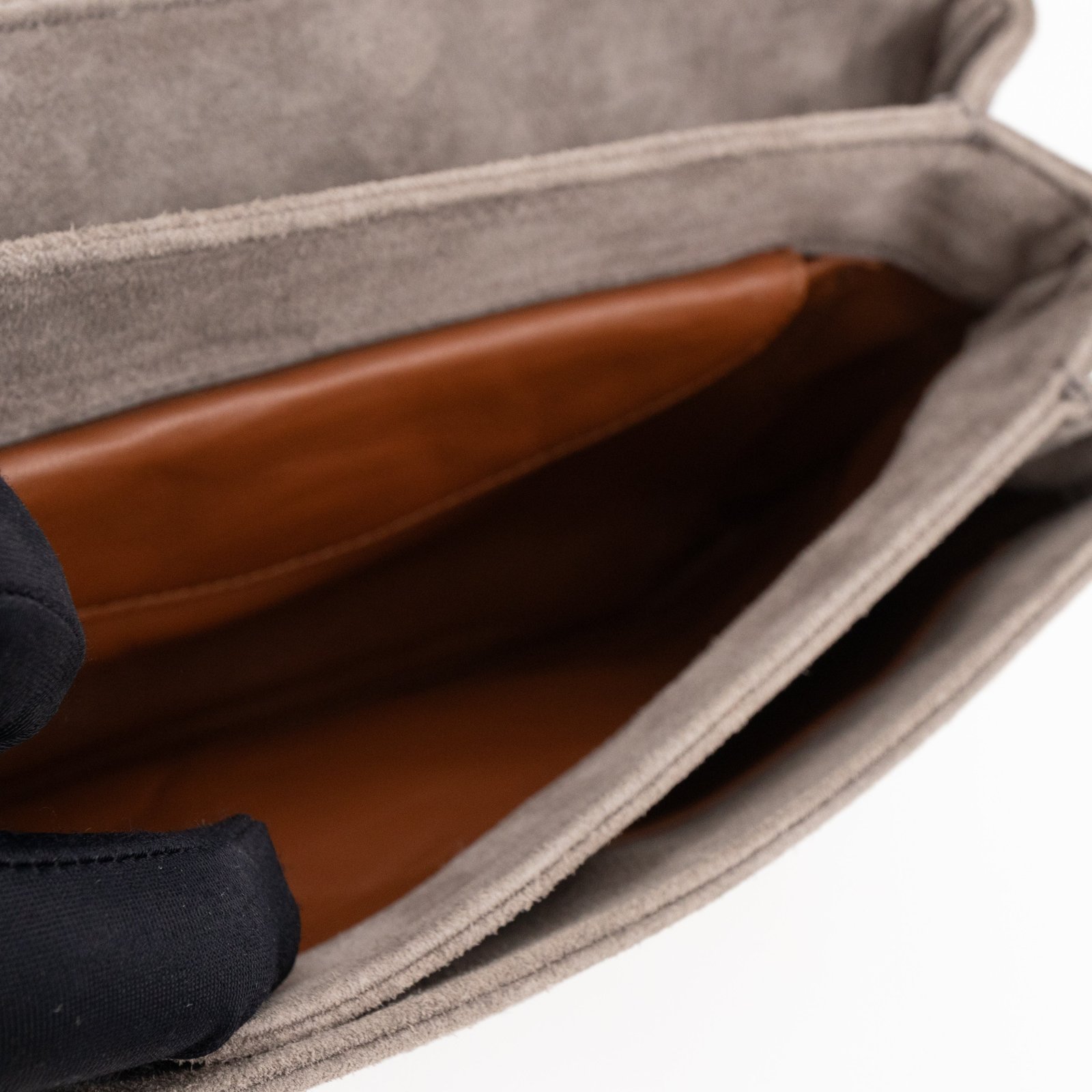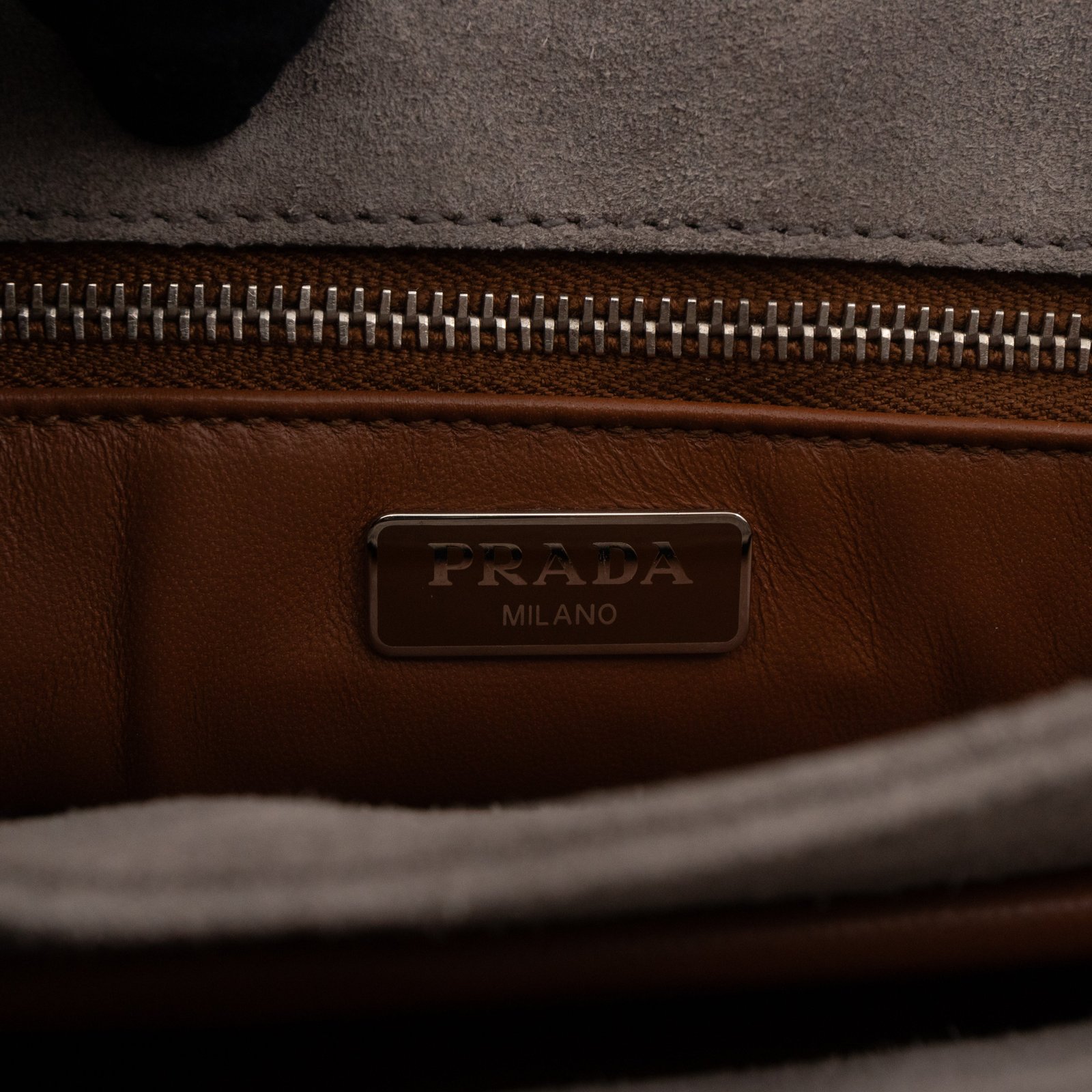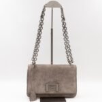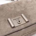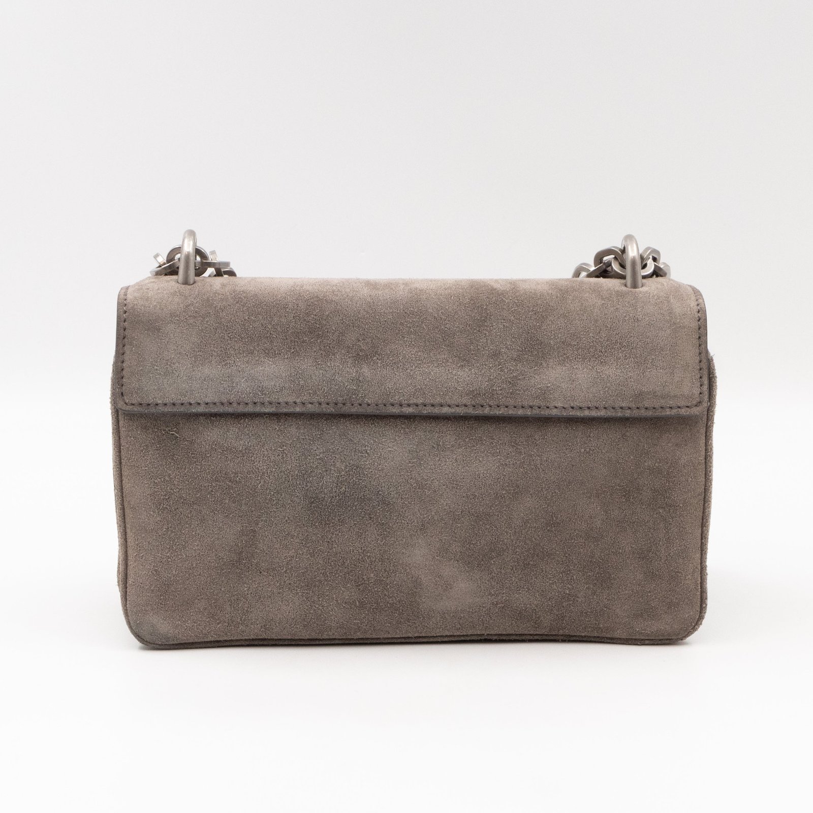 This is a Prada chain flap shoulder bag. Made in grey suede leather. The bag features a silver-tone metal flap closure and a chain link shoulder strap. The flap opens to three layers and all of which are brown smooth leather. Shoulder chain can be carried on the shoulder or crossbody.