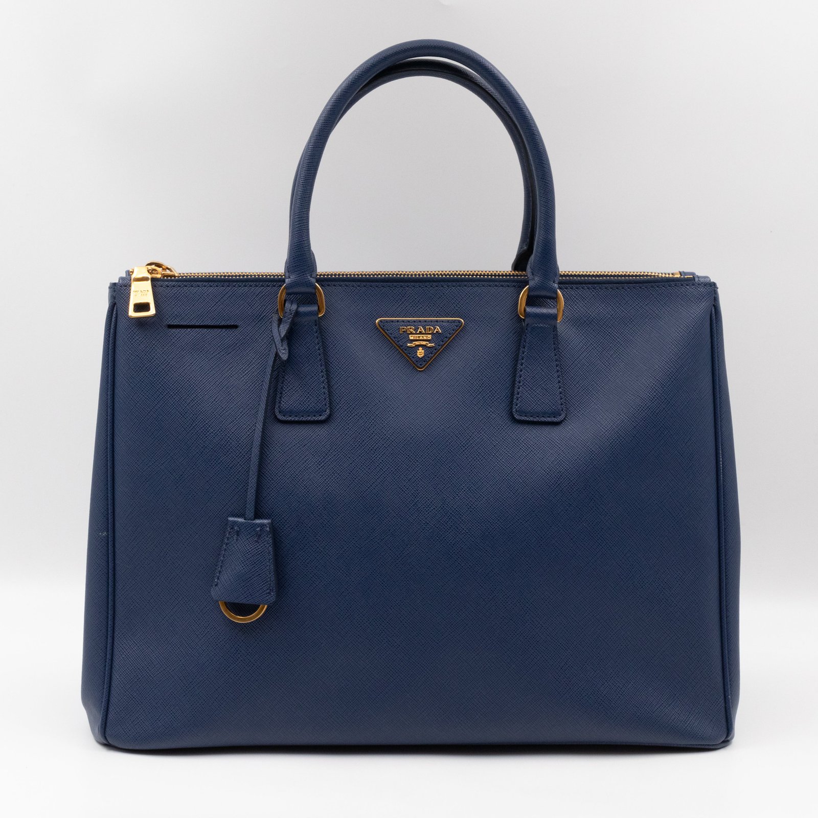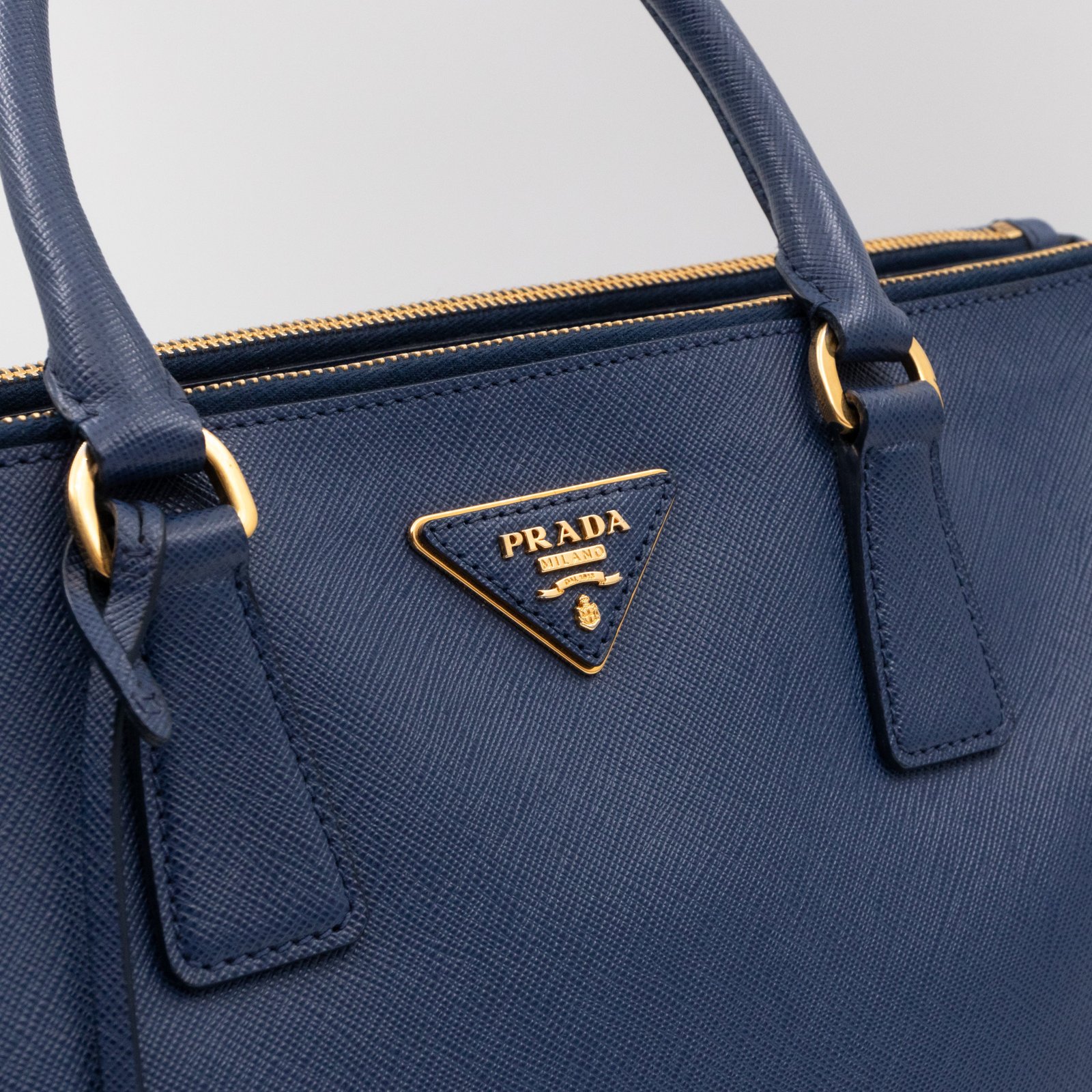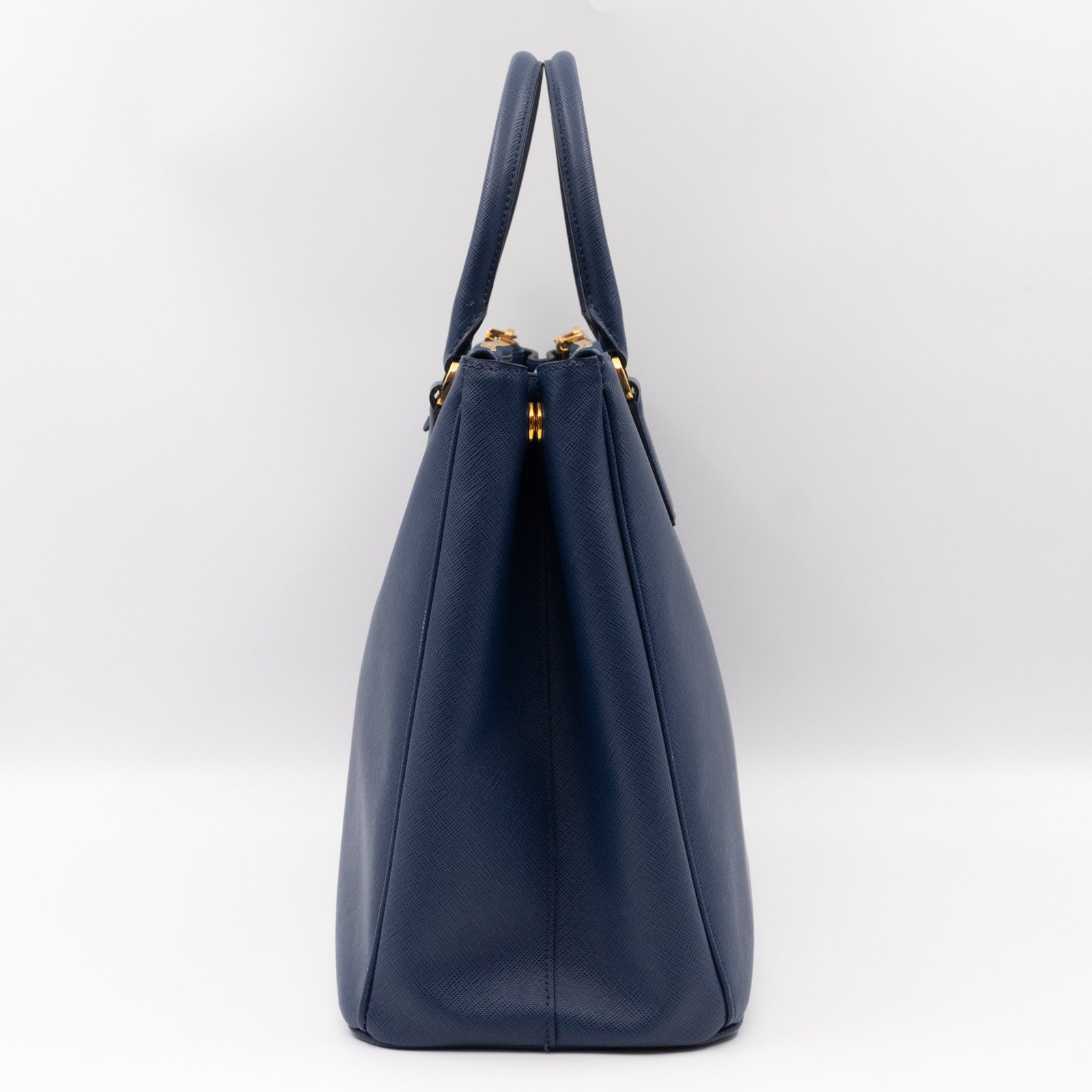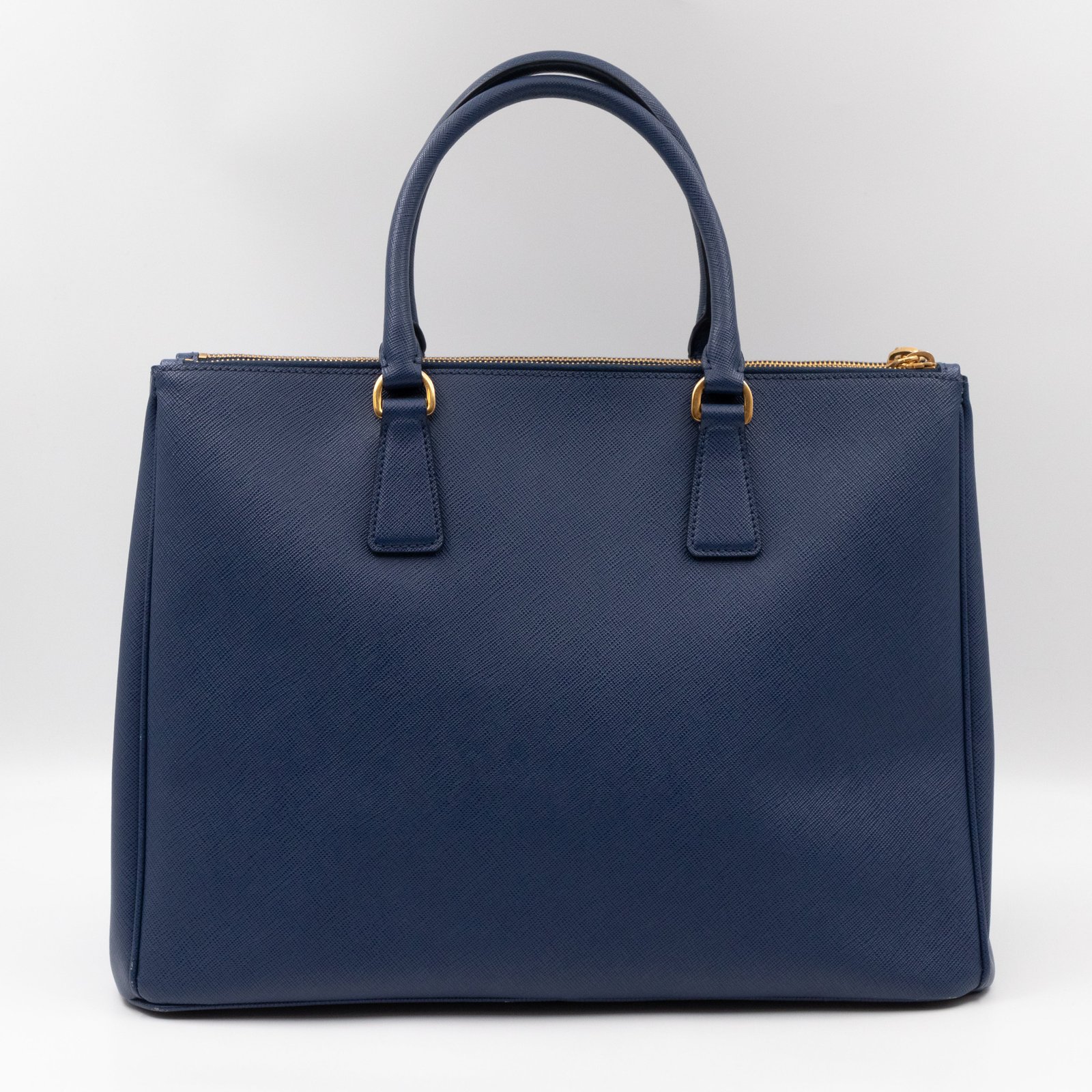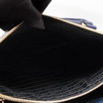 A Prada Galleria Large Double Zip bag in durable Saffiano leather. Very convenient double zipper bag in a blue color, combined with gold-tone hardware. This larger size fits your ipad, wallet, documents and even a small laptop. Great choice for daily and work use. Each side has zipper pockets, the middle compartment expands to a spacious size. Has no shoulder strap.
