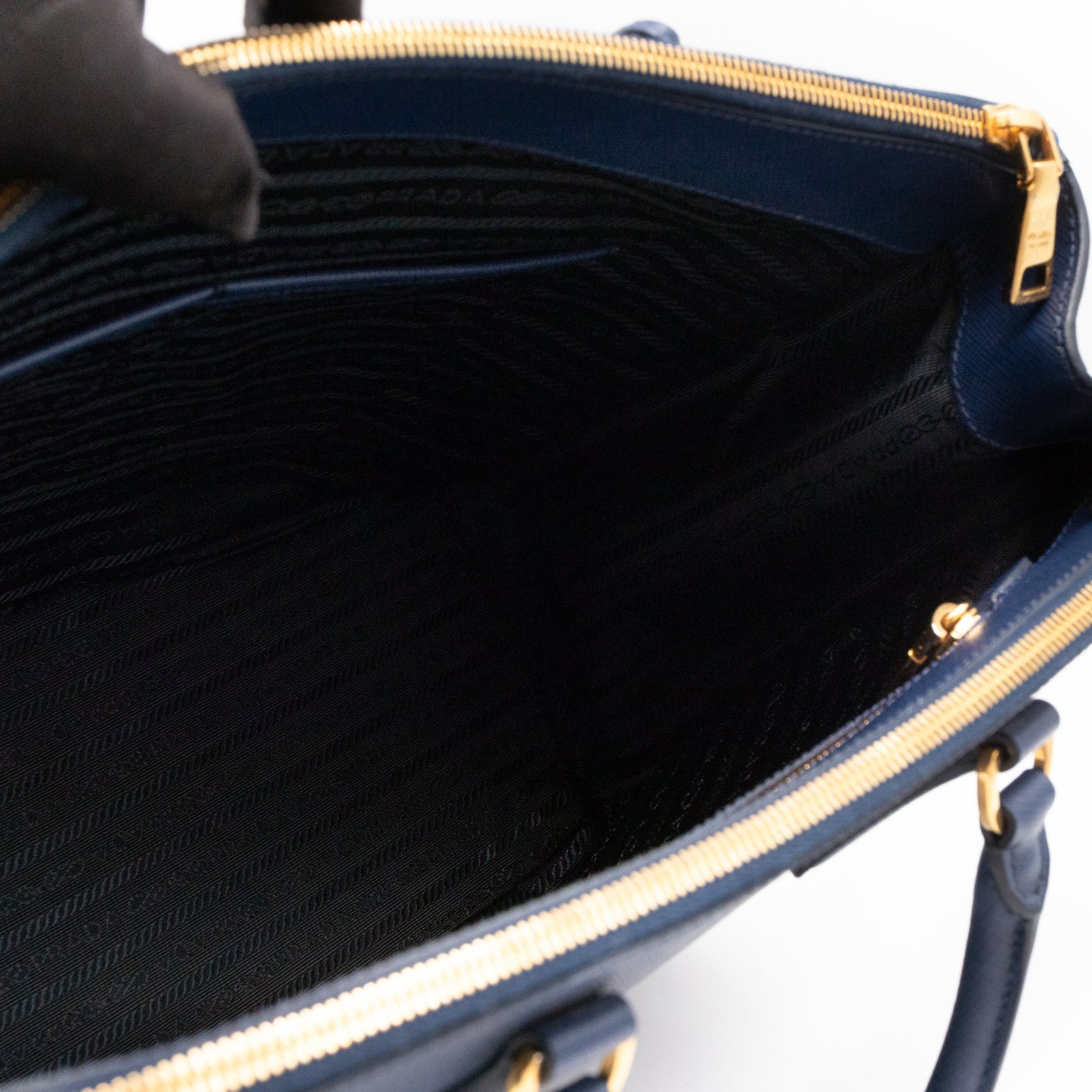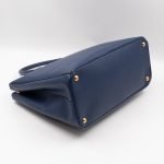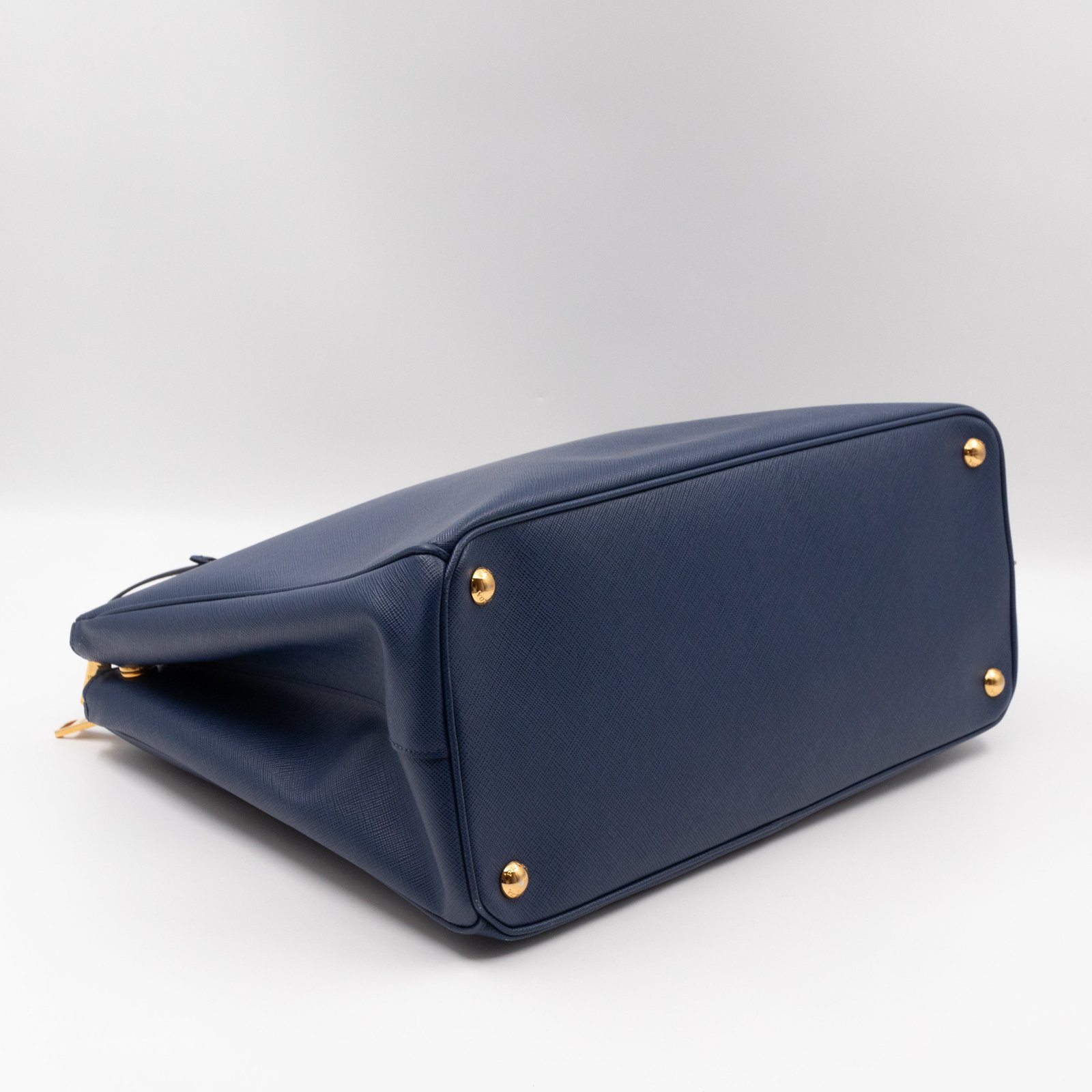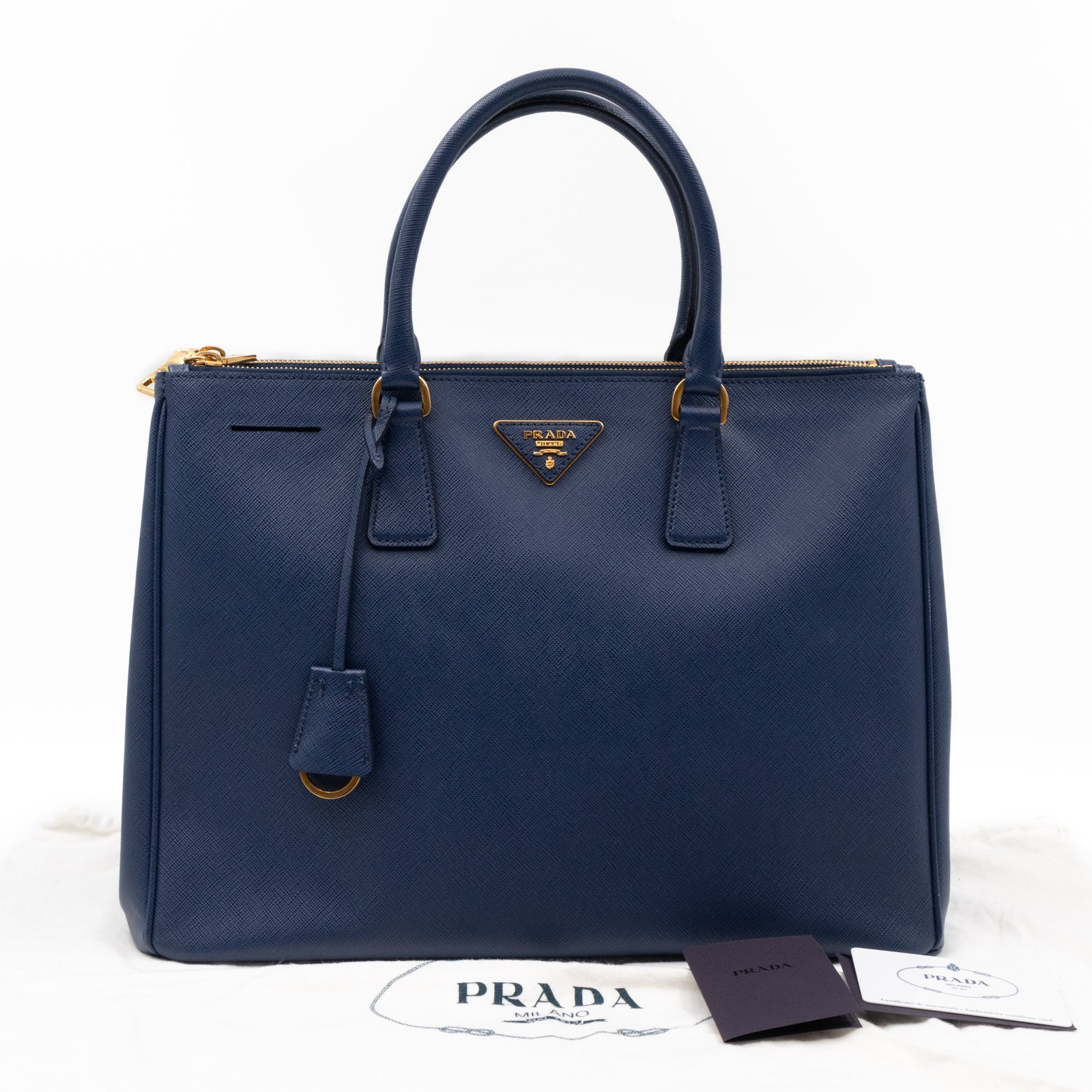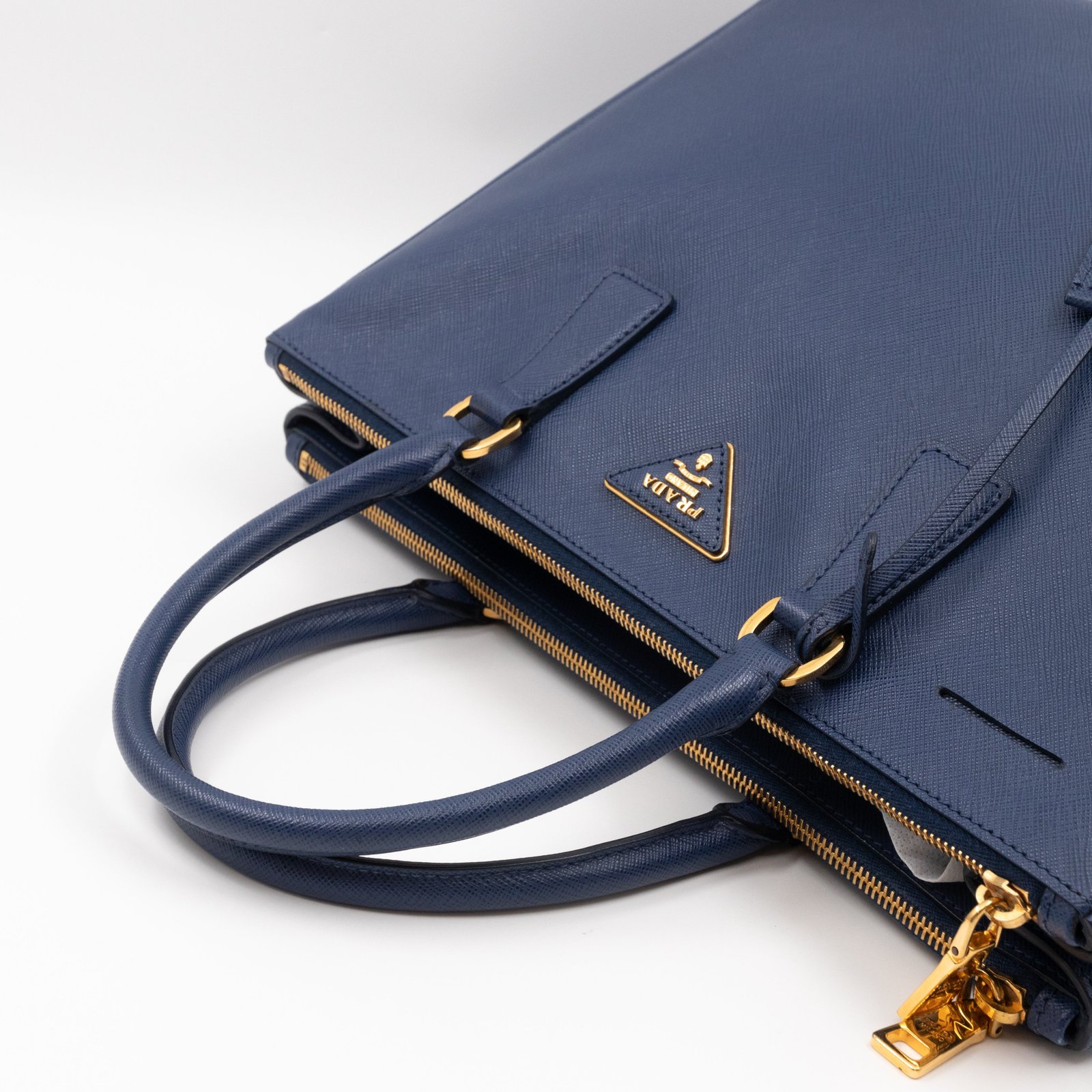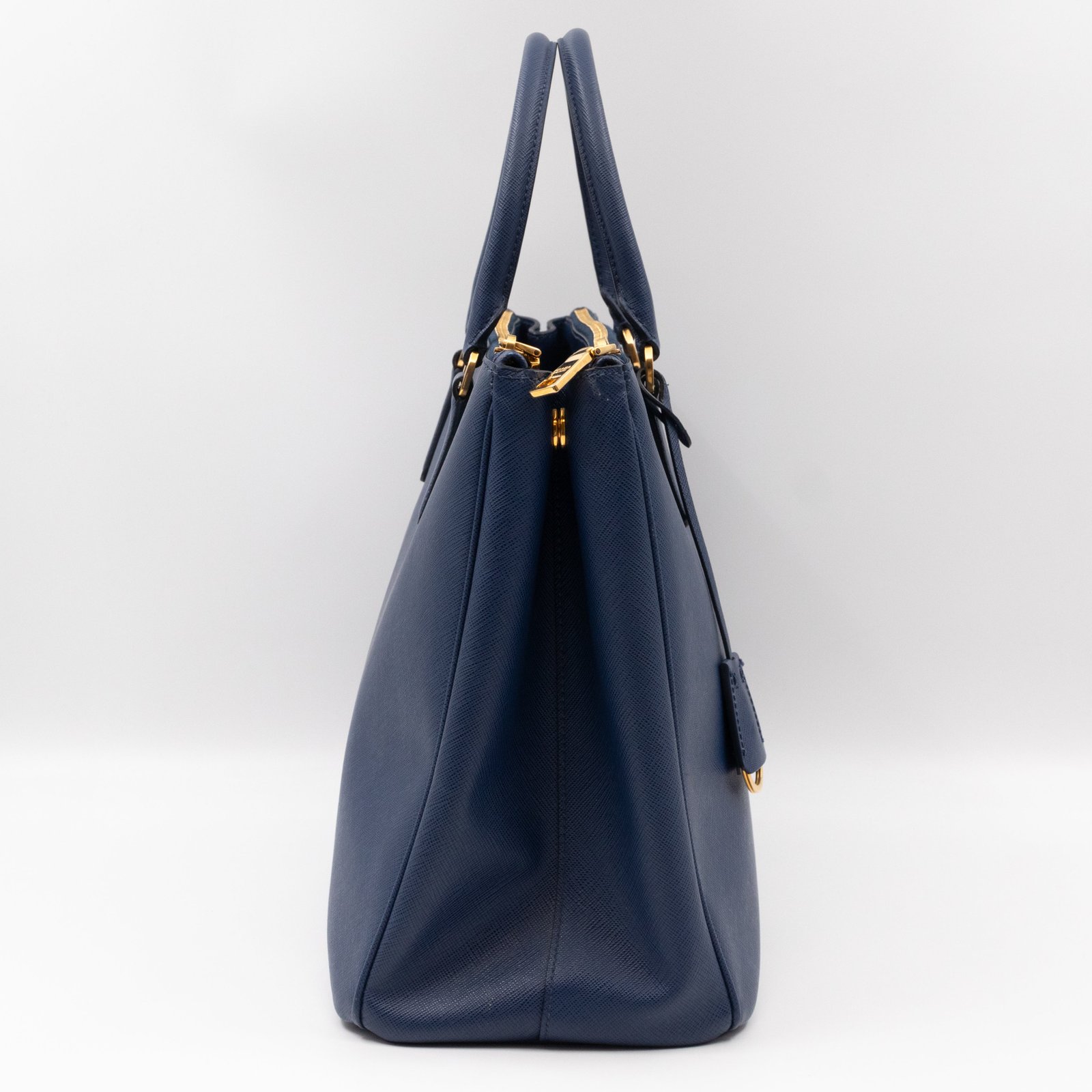 A Prada Galleria Large Double Zip bag in durable Saffiano leather. Very convenient double zipper bag in a blue color, combined with gold-tone hardware. This larger size fits your ipad, wallet, documents and even a small laptop. Great choice for daily and work use. Each side has zipper pockets, the middle compartment expands to a spacious size. Has no shoulder strap.