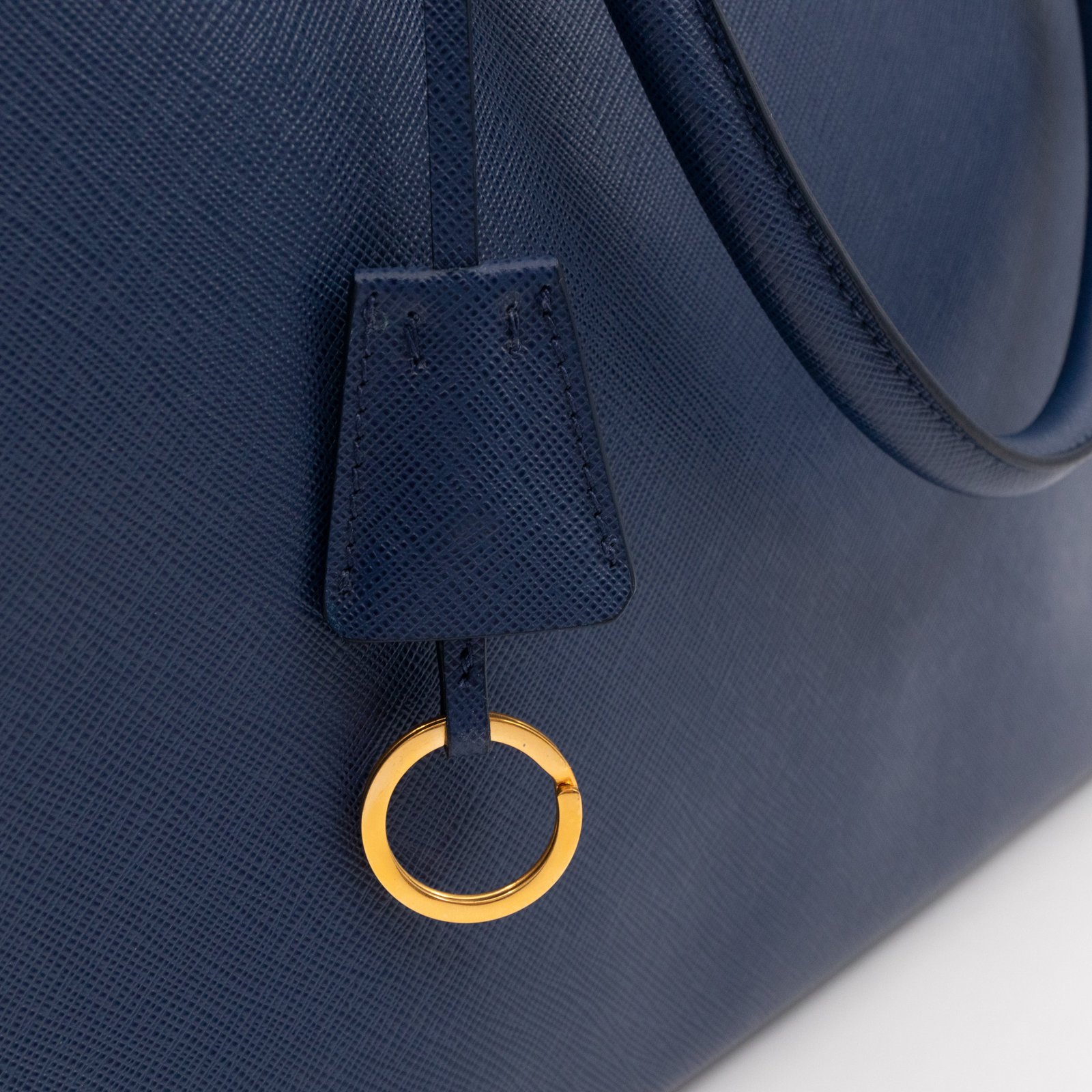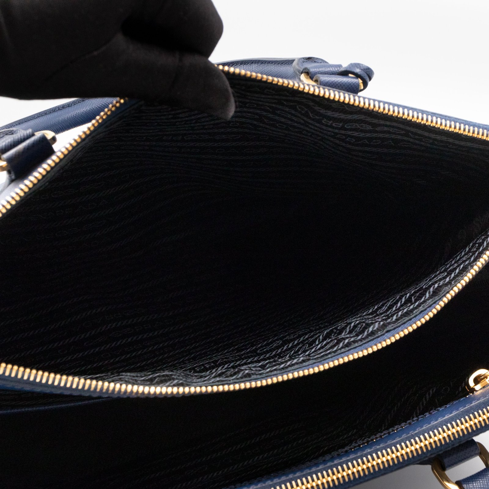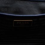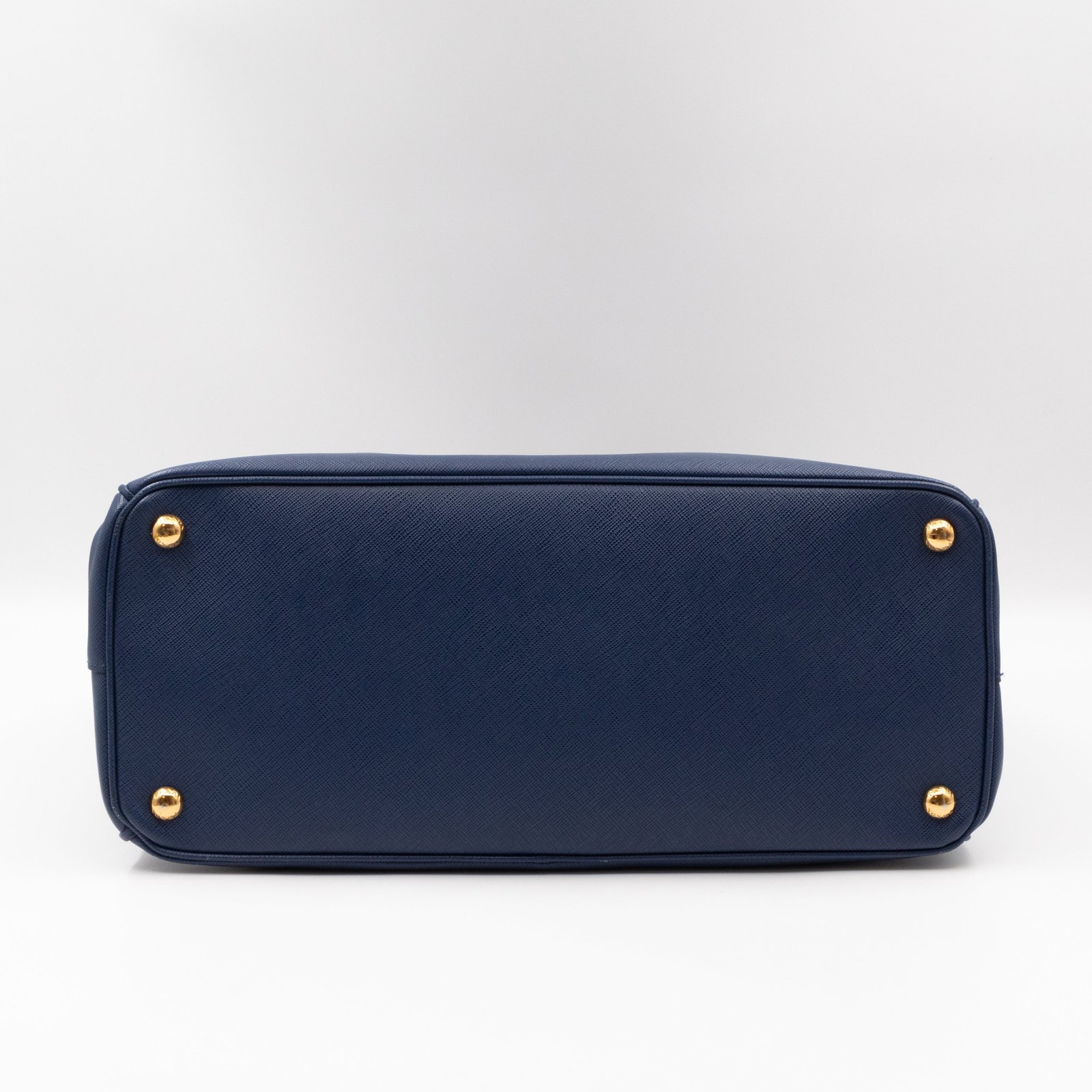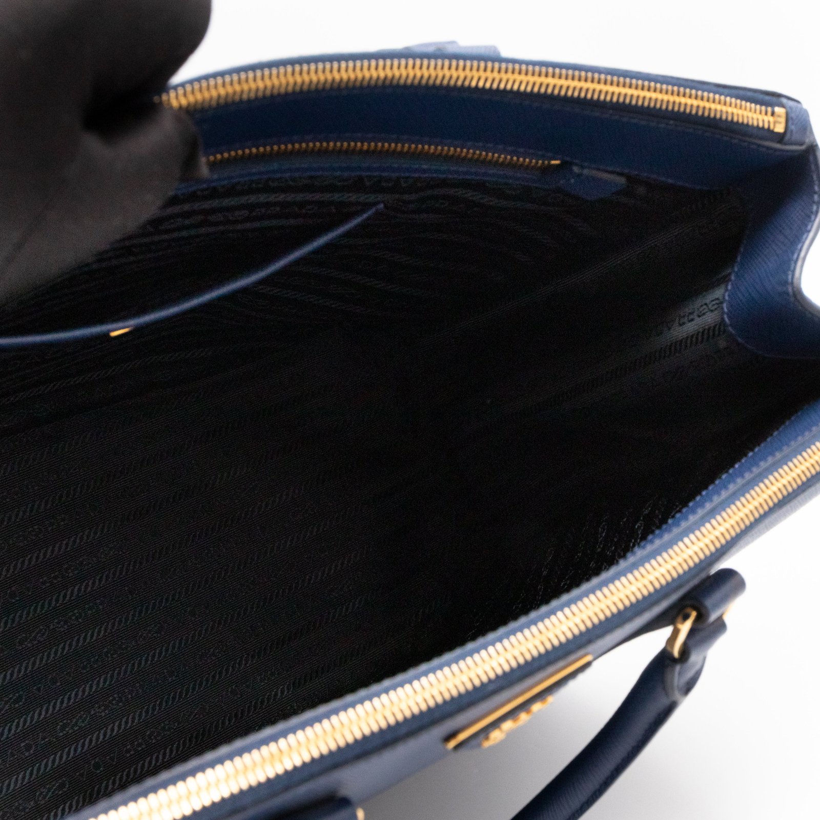 A Prada Galleria Large Double Zip bag in durable Saffiano leather. Very convenient double zipper bag in a blue color, combined with gold-tone hardware. This larger size fits your ipad, wallet, documents and even a small laptop. Great choice for daily and work use. Each side has zipper pockets, the middle compartment expands to a spacious size. Has no shoulder strap.