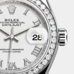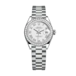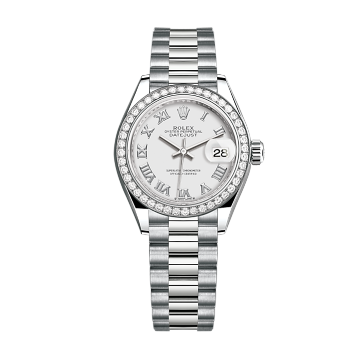 The light reflections on the case sides and lugs highlight the elegant profile of the 28 mm Oyster case, which is fitted with a diamond-set bezel. Rolex’s classic feminine watch, the Lady-Datejust is in the lineage of the Datejust, the emblematic model that has been a byword for style and accurate timekeeping.