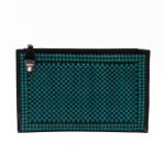 This is a madras woven clutch from Prada. It is made with leather in turquoise and black color, features a wrist strap on one side, and with a silver-tone Prada logo on the zip. The zip can be inserted into the front buckle. The interior is spacious enough with a zipper pocket. There is a handle on the back to carry it more easily. A good choice for an evening event.