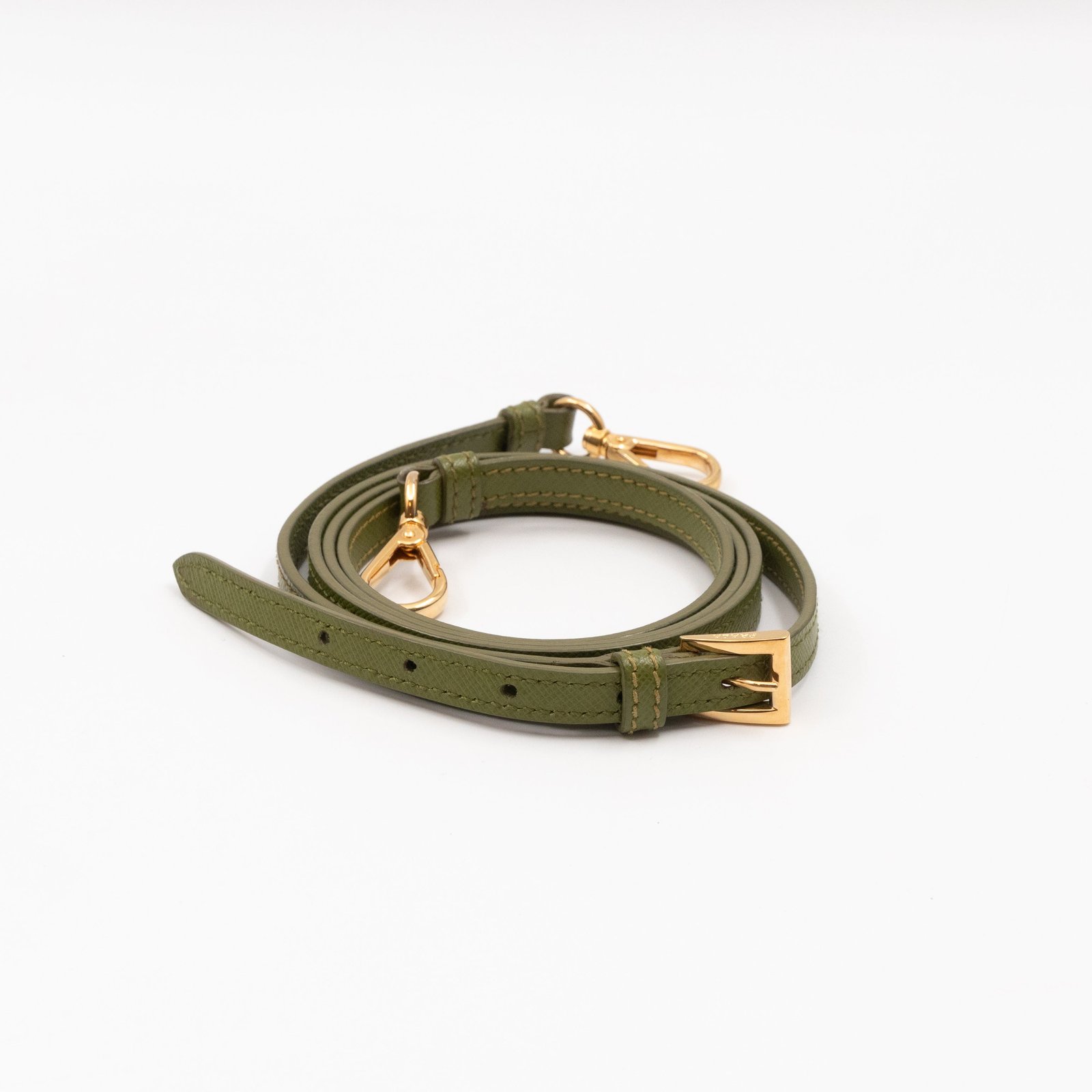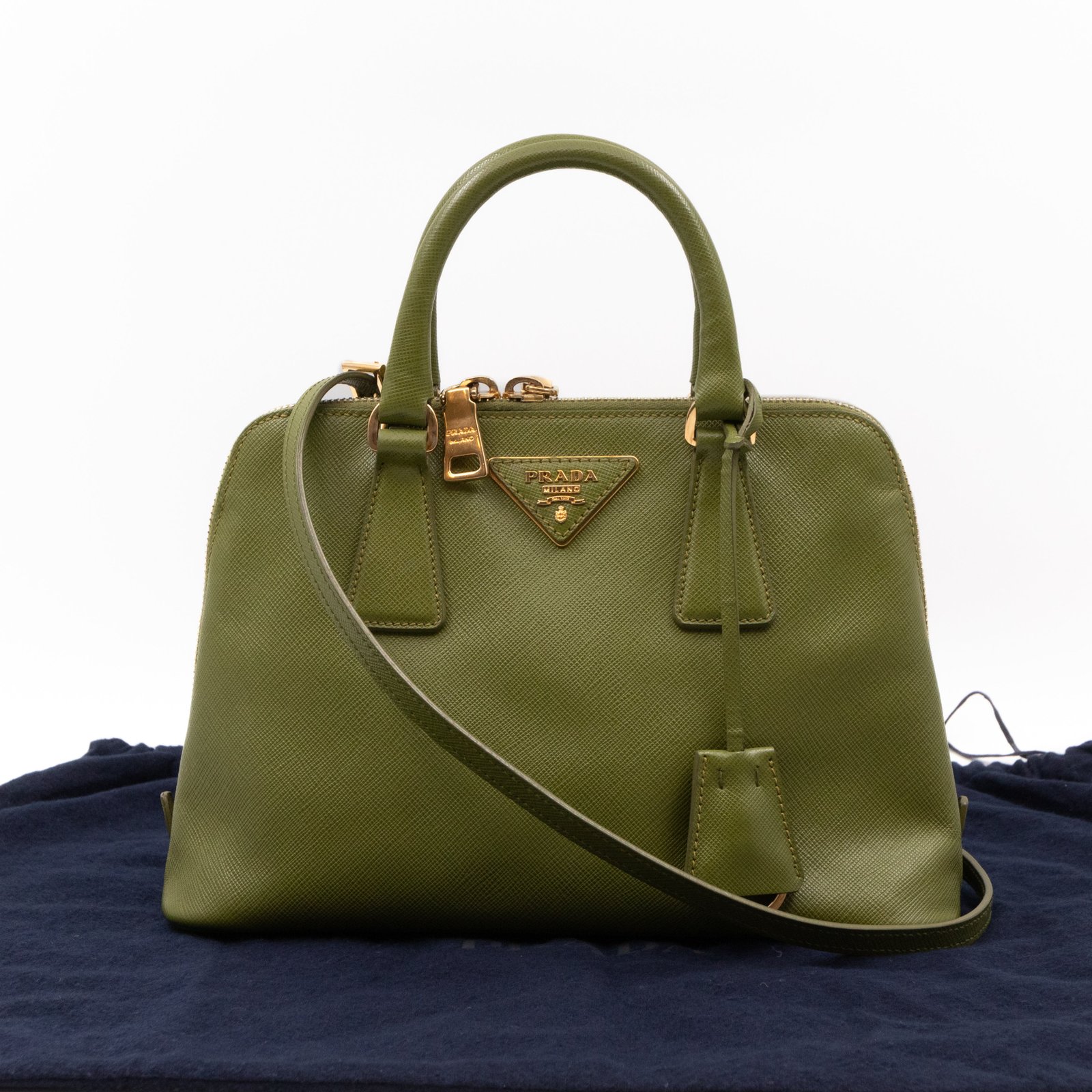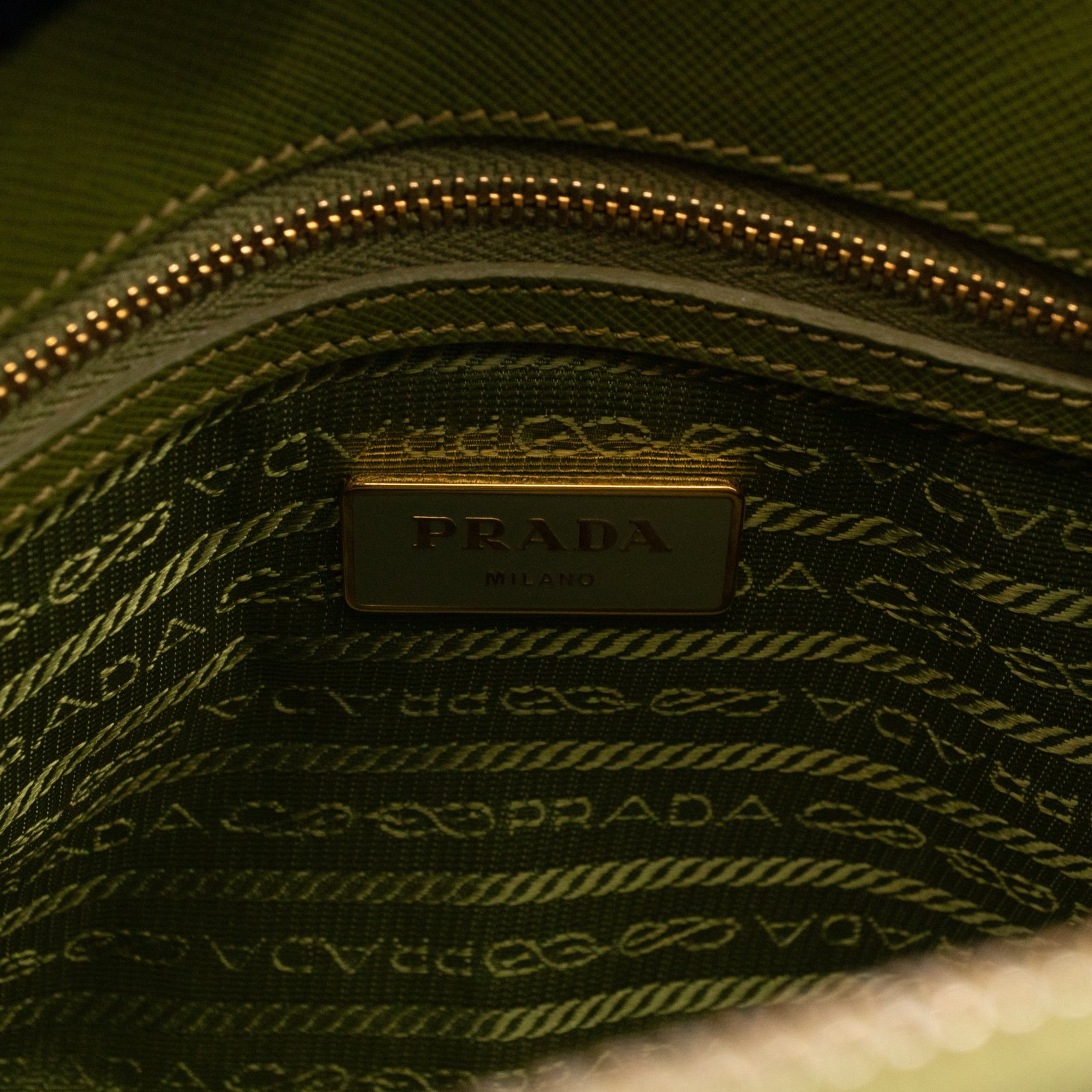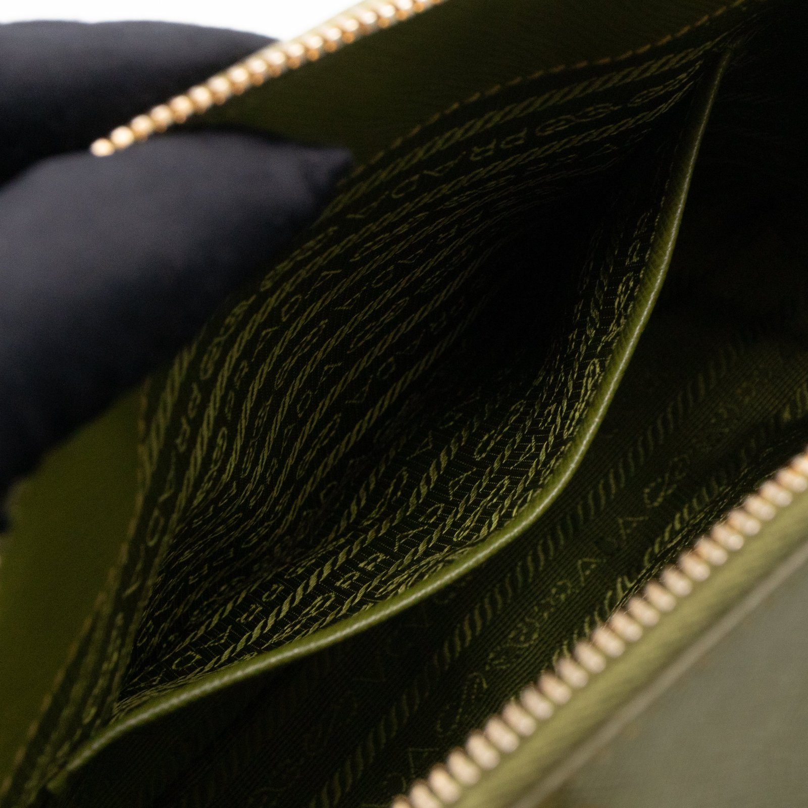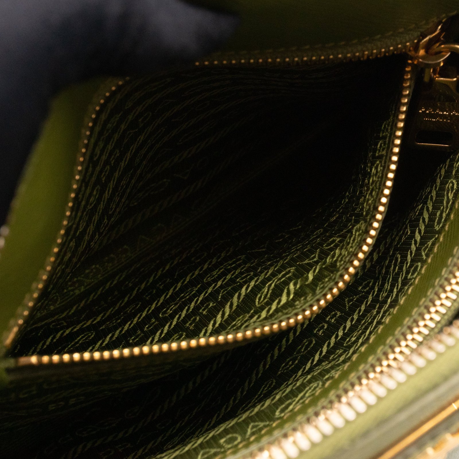 A cute small sized edition Prada Promenade crossbody bag. Made with Saffiano leather in green, combined with gold-tone hardware. This Promenade fits large phone, a card holder, with other small items. Open to two compartments and two slim pocket.