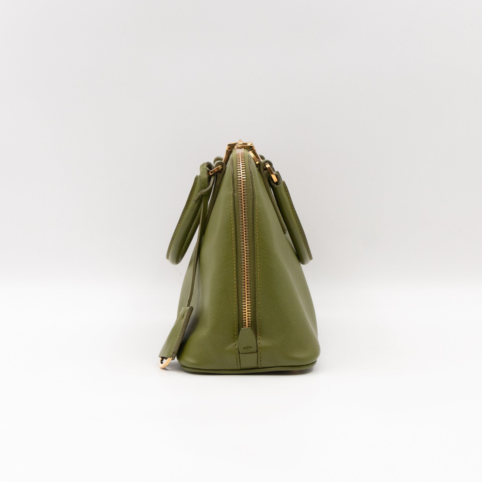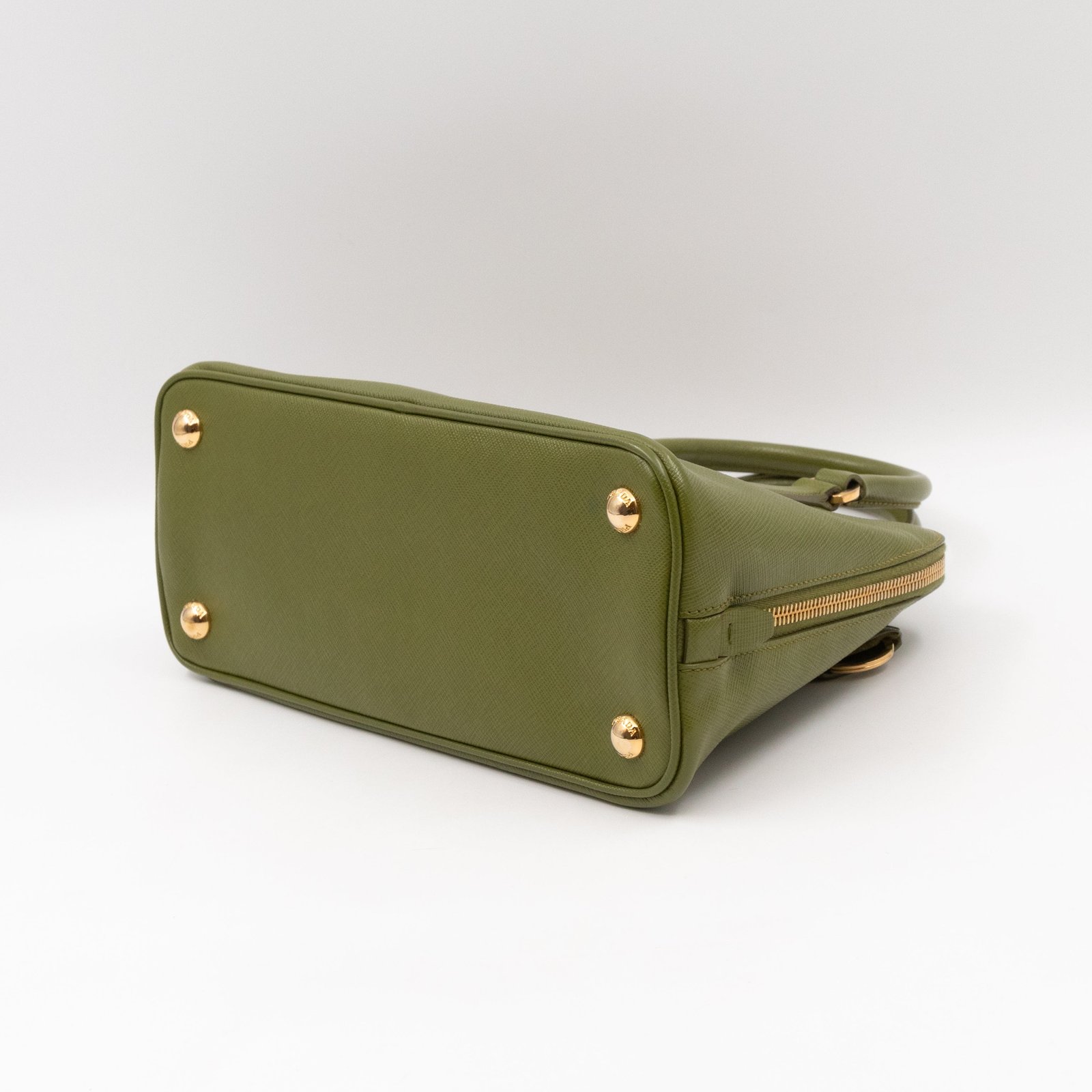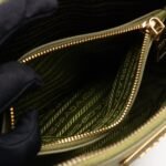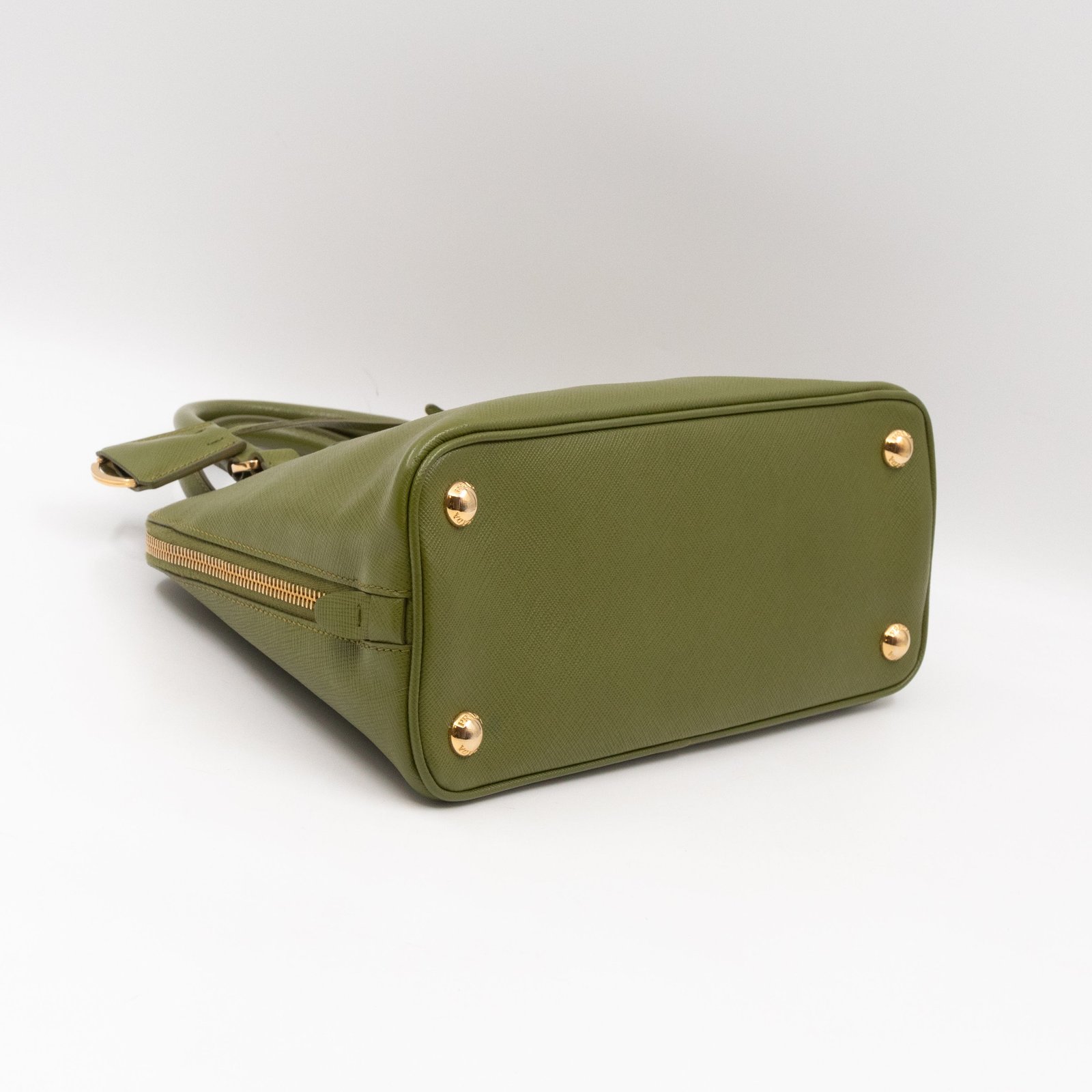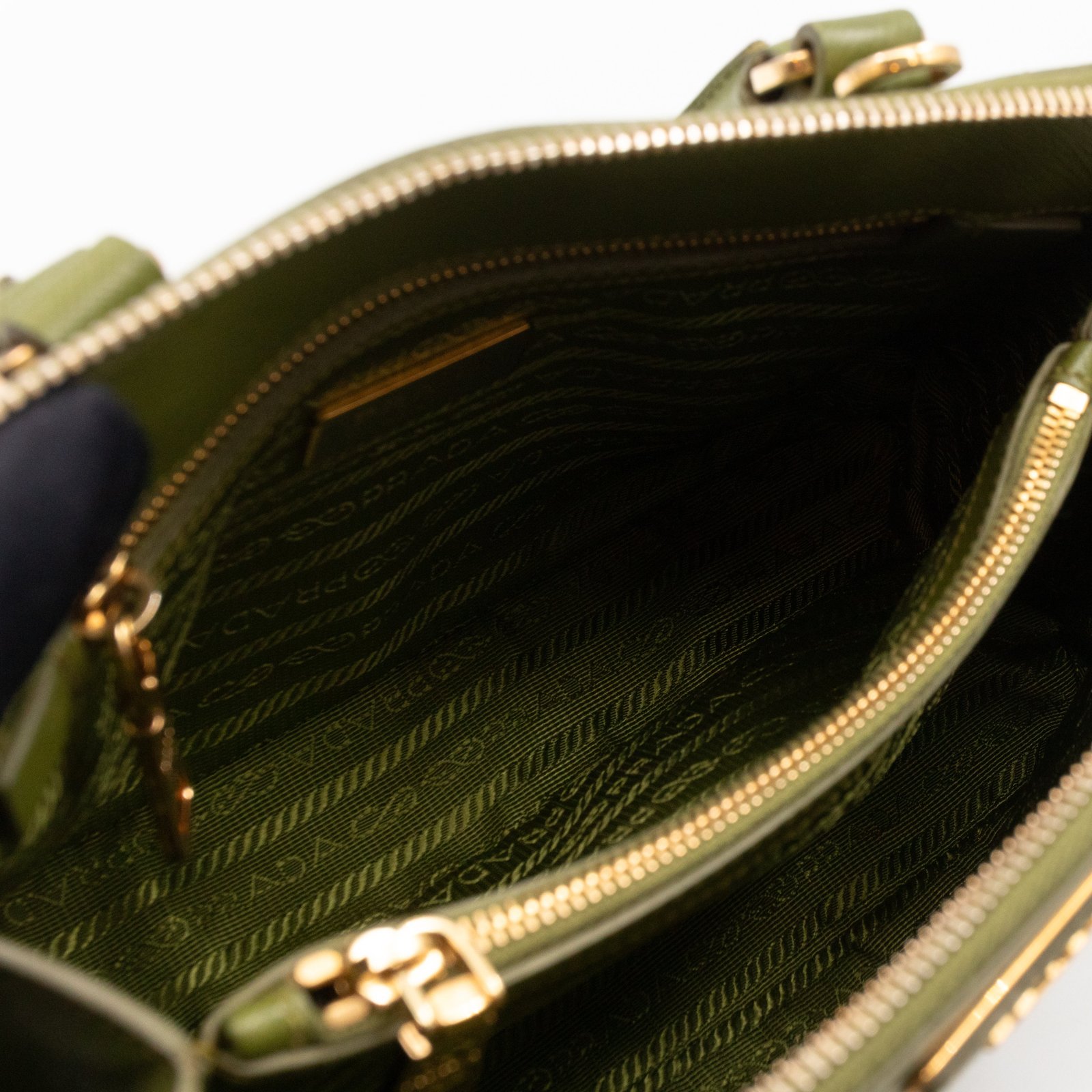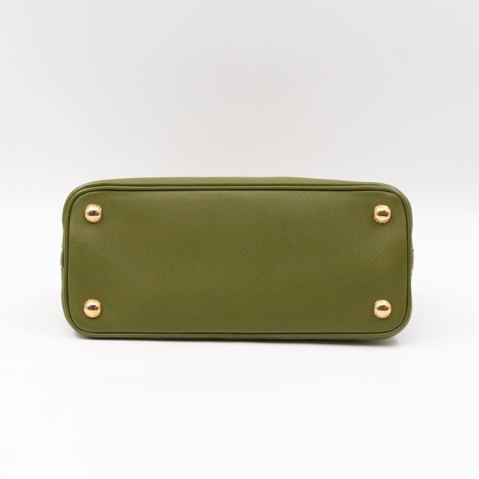 A cute small sized edition Prada Promenade crossbody bag. Made with Saffiano leather in green, combined with gold-tone hardware. This Promenade fits large phone, a card holder, with other small items. Open to two compartments and two slim pocket.