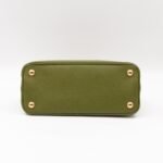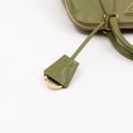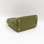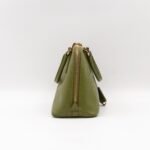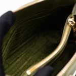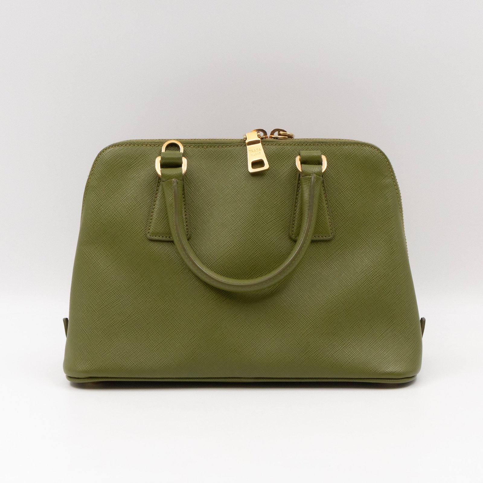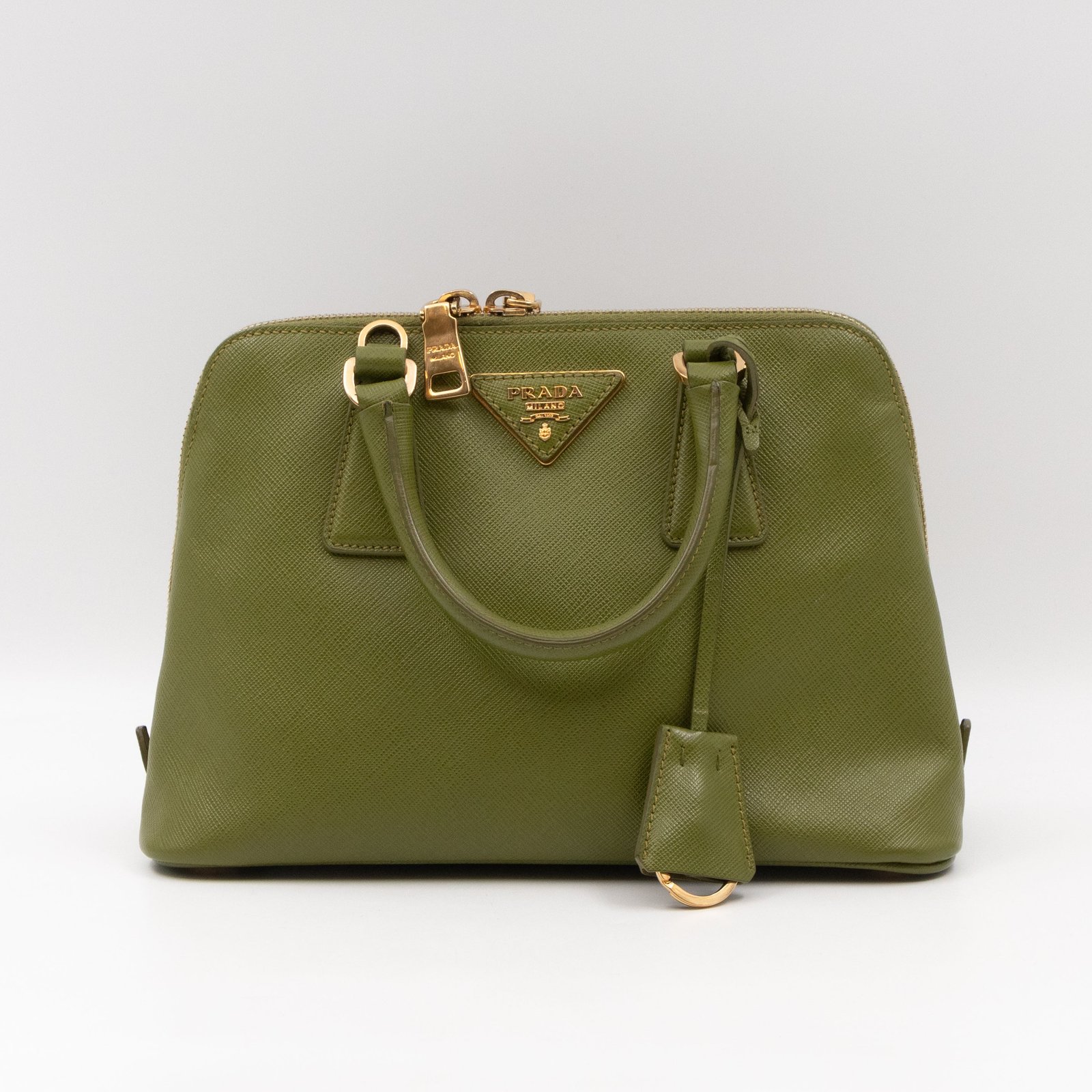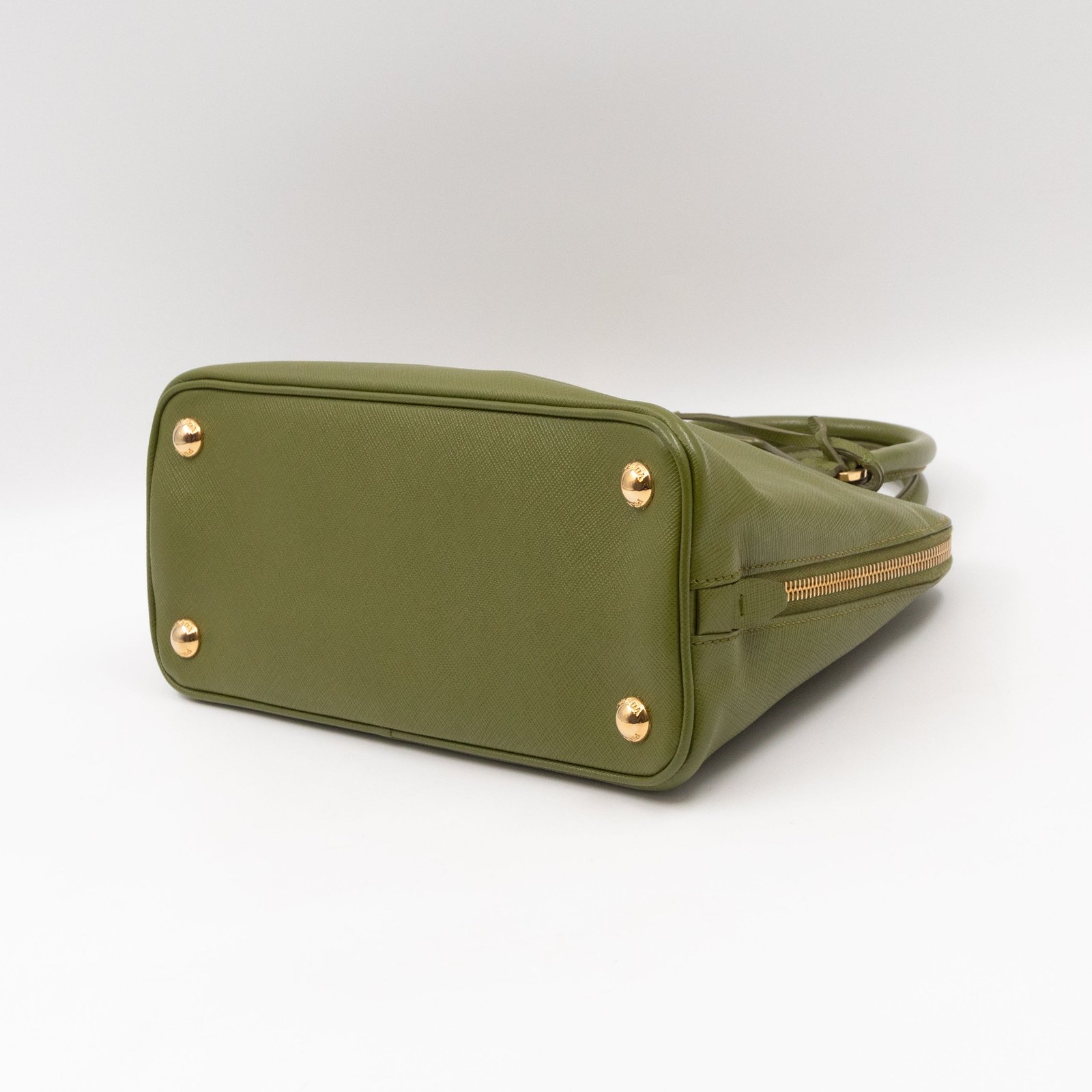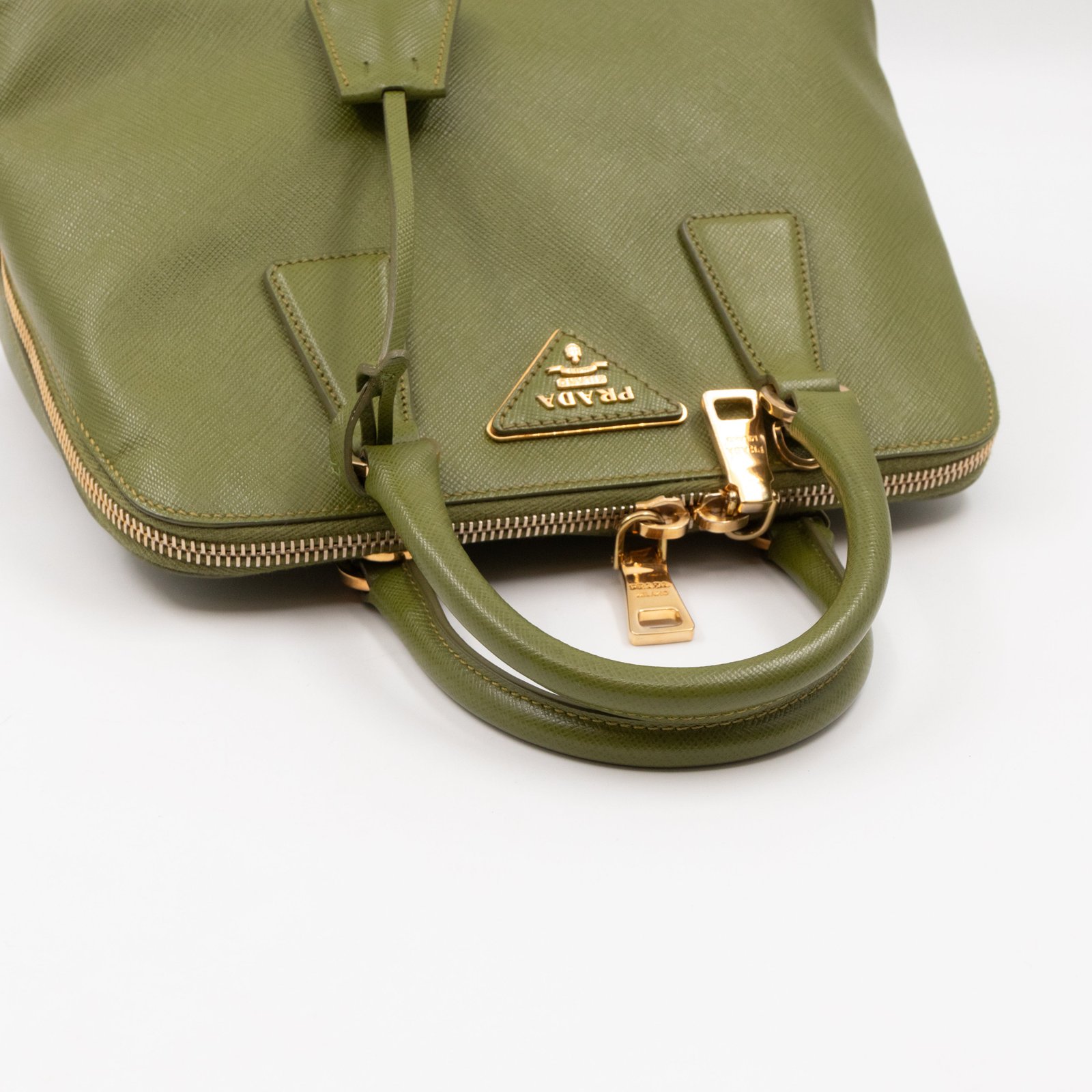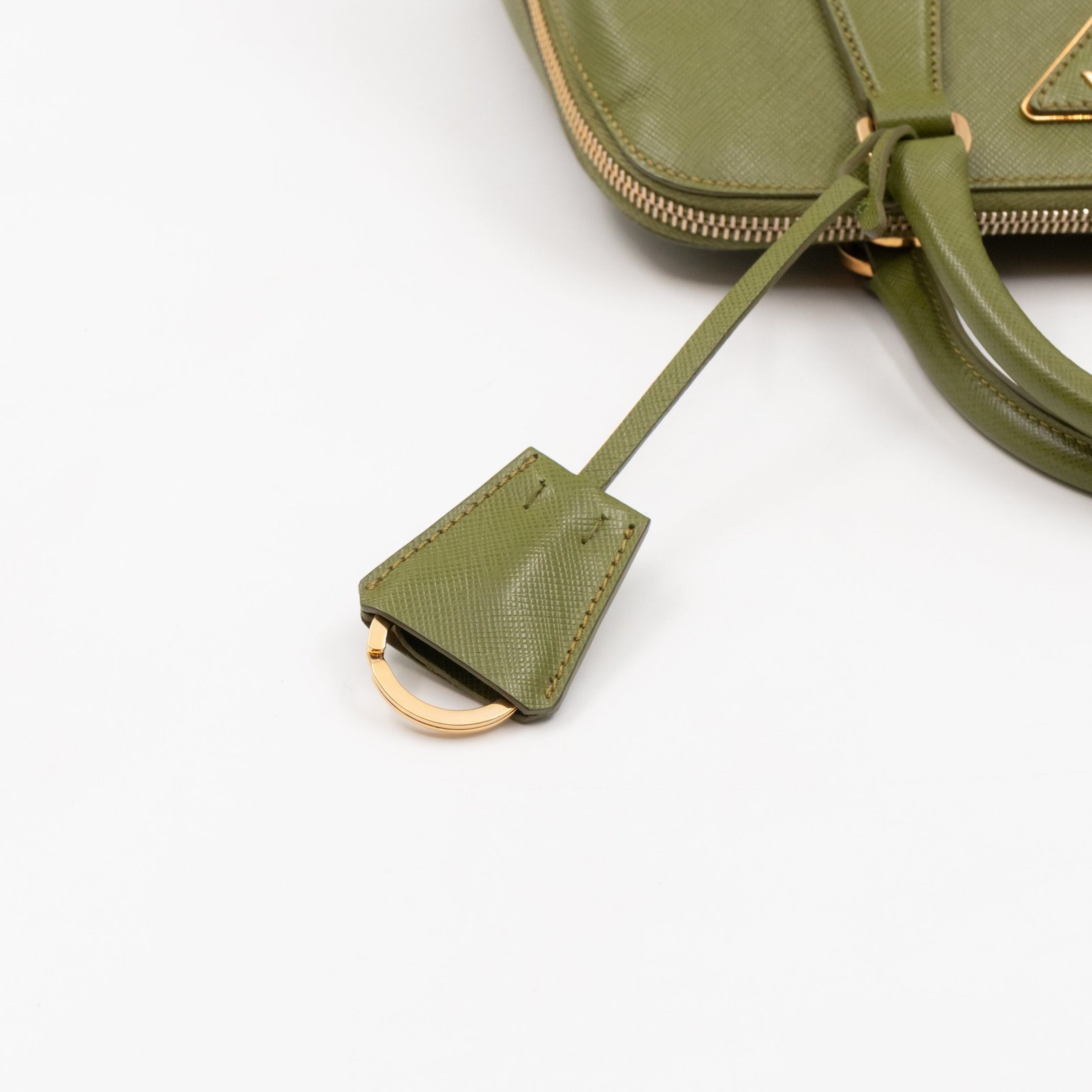 A cute small sized edition Prada Promenade crossbody bag. Made with Saffiano leather in green, combined with gold-tone hardware. This Promenade fits large phone, a card holder, with other small items. Open to two compartments and two slim pocket.