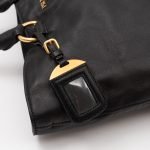 A large and charming shopping tote from Prada. Made with black leather with gold-tone hardware. Dual handles and an adjustable shoulder strap. Spacious insides with slim pocket on one side and a large zipper pocket on the other side. Button closure in the middle to keep your items safe.