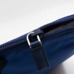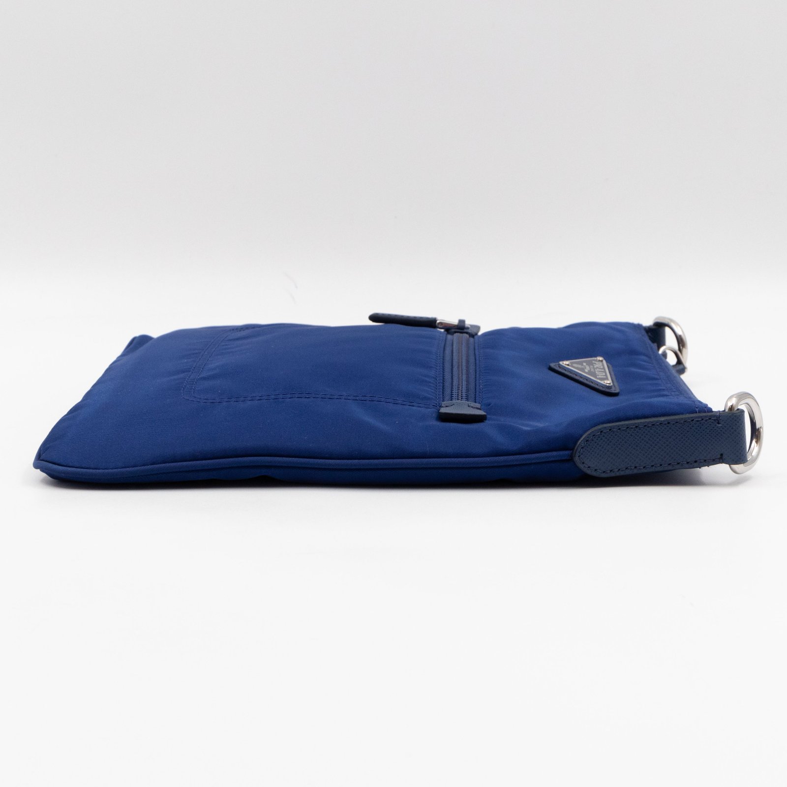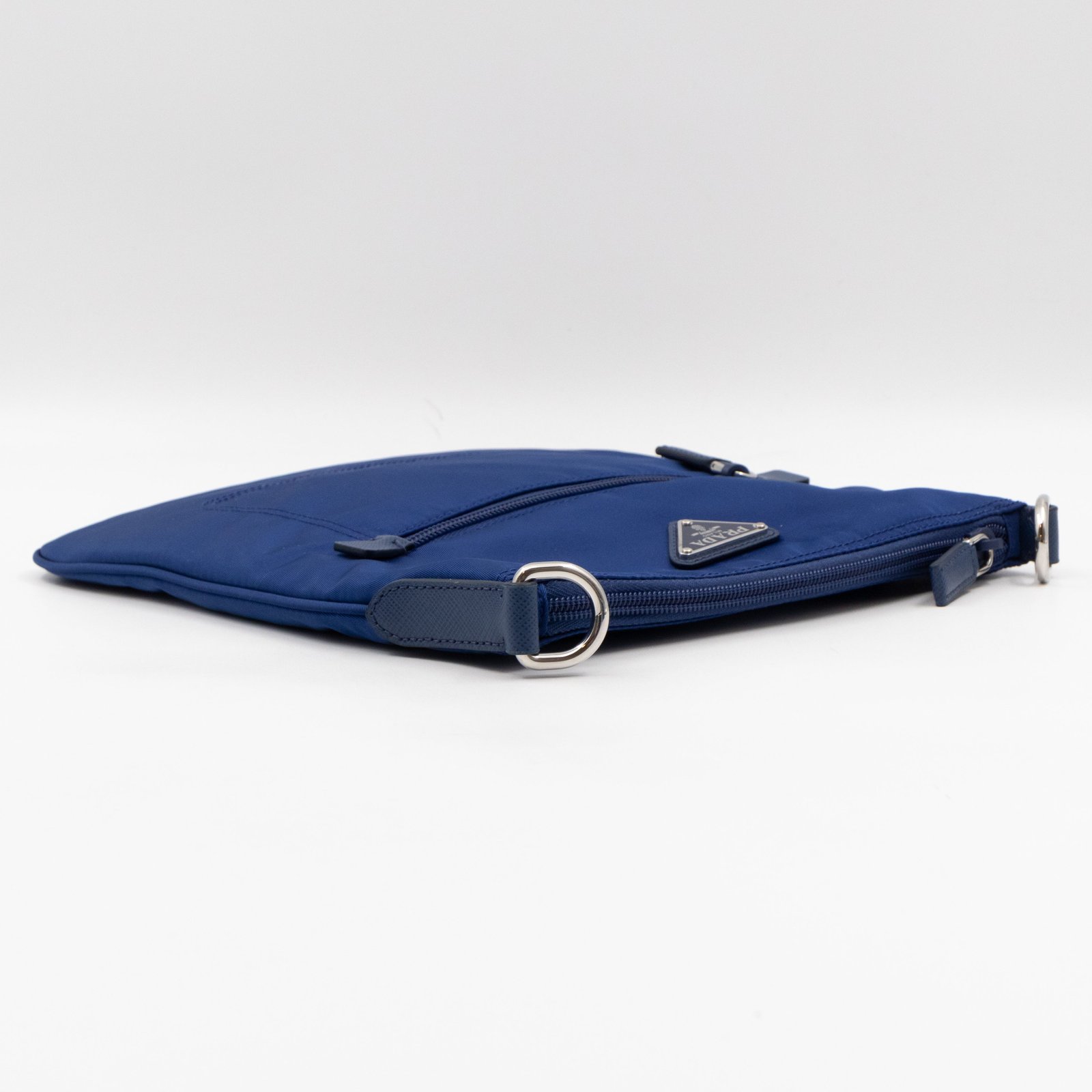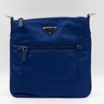 A sporty small crossbody messenger bag by Prada. The classic series tessuto nylon bags have recently returned in popularity. Made with blue tessuto nylon and fabric, combined with matching leather accents and silver-tone hardware. Adjustable crossbody strap for comfortable wear. Slim design with two zipper compartments for ease of use, inside are slim pockets. Great for travel and daily use.