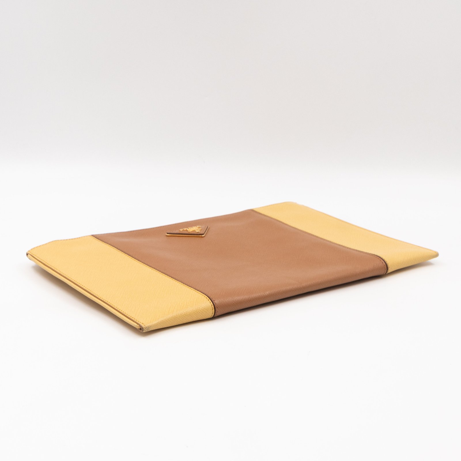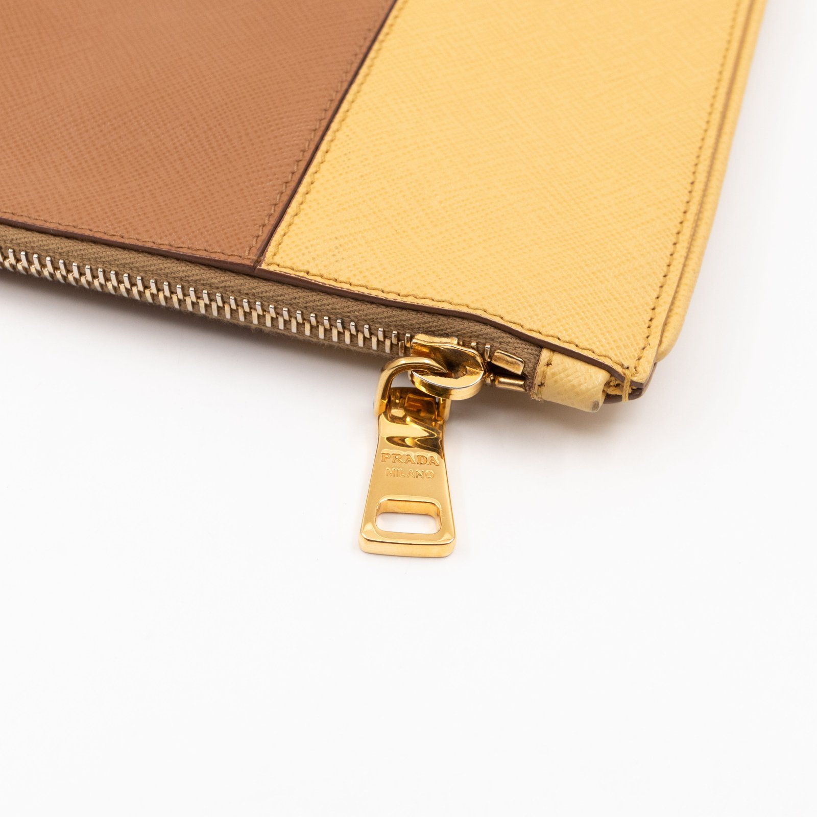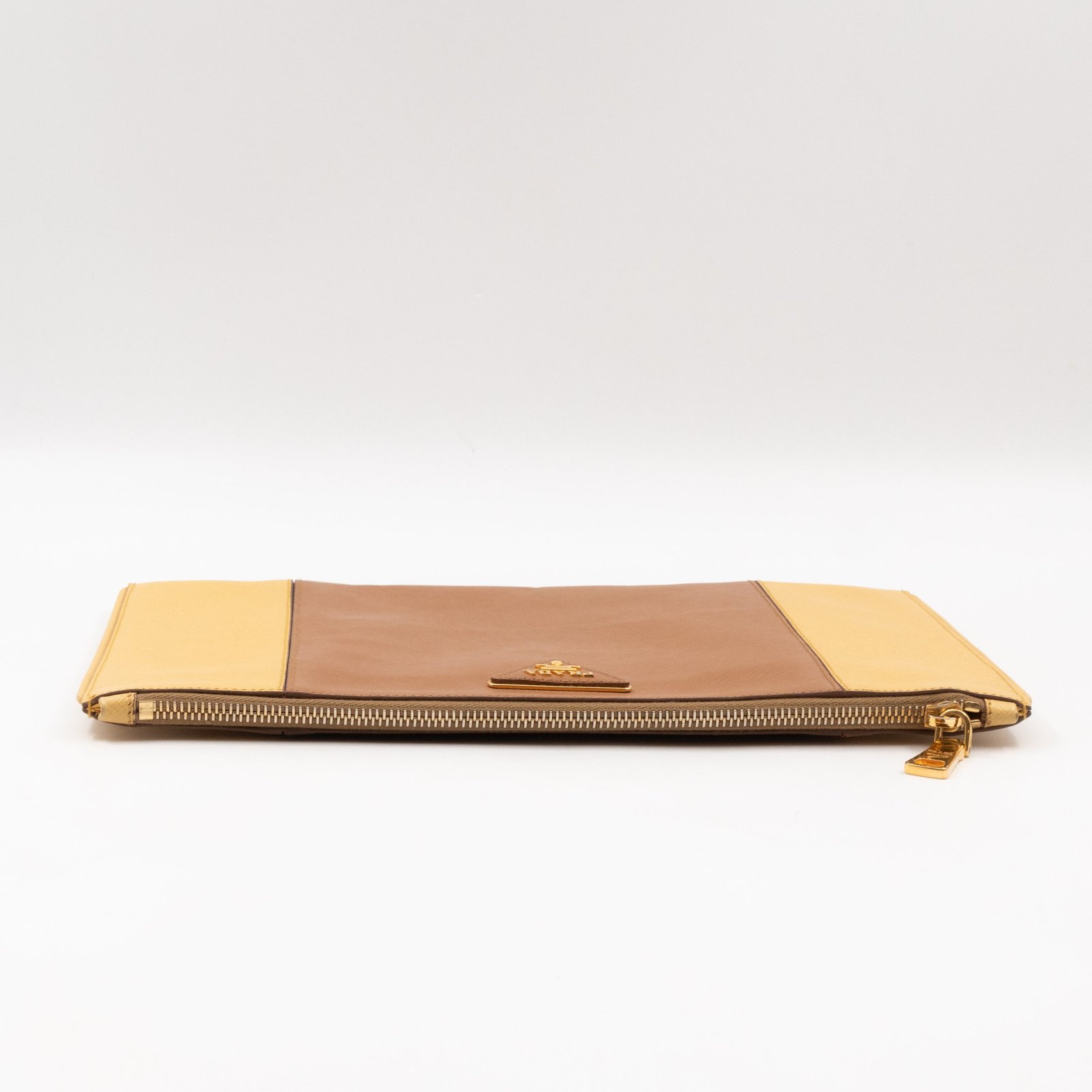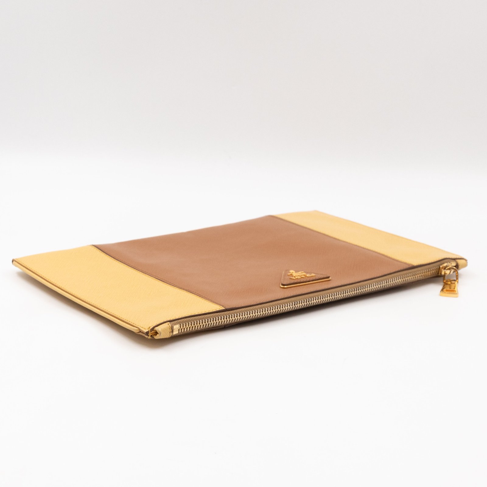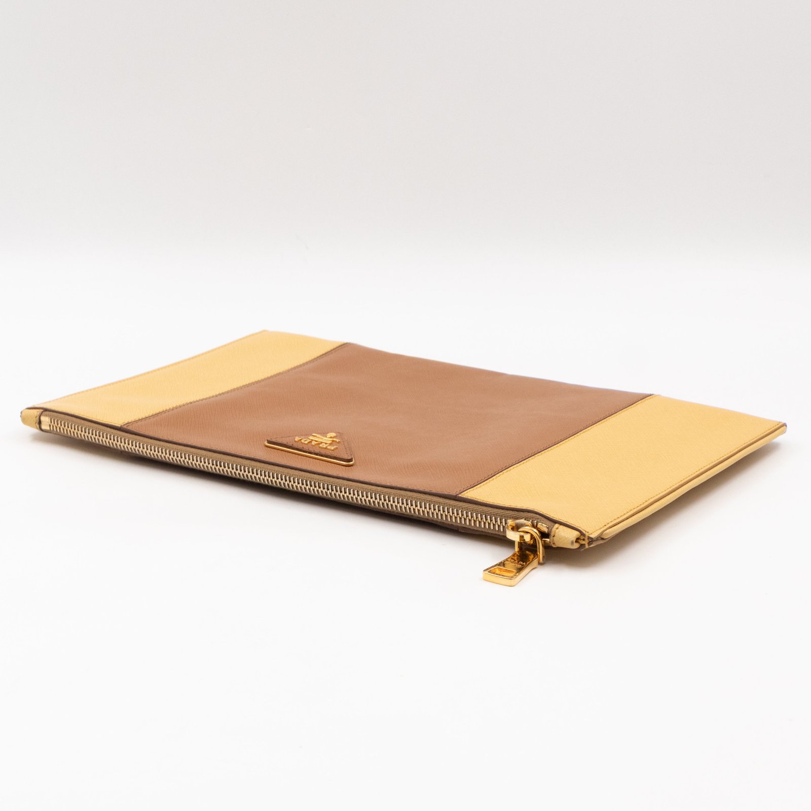 This is a zip clutch bag from Prada. It is made with saffiano leather in yellow and brown color, features a wrist strap on one side, and with a gold-tone Prada logo on the front. The interior is spacious enough with a zipper pocket. There is a handle on the back to carry it more easily. A good choice for an evening event.