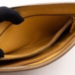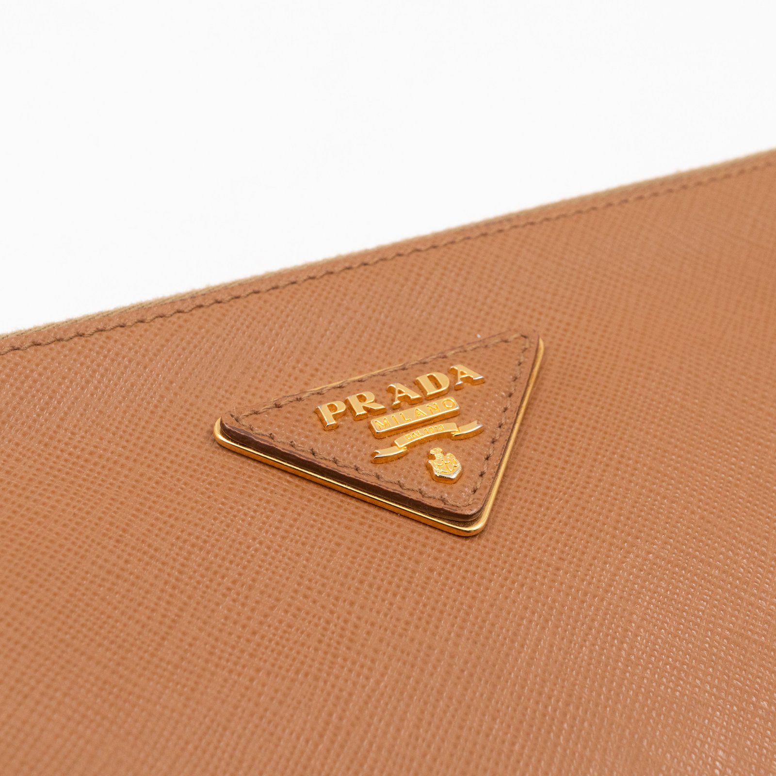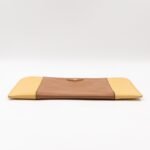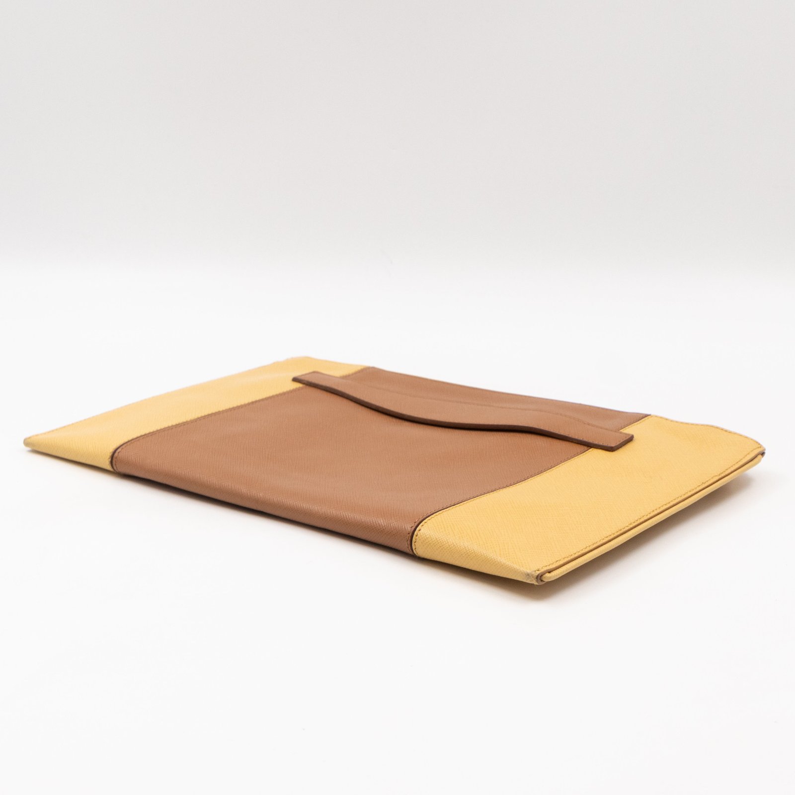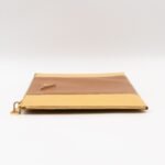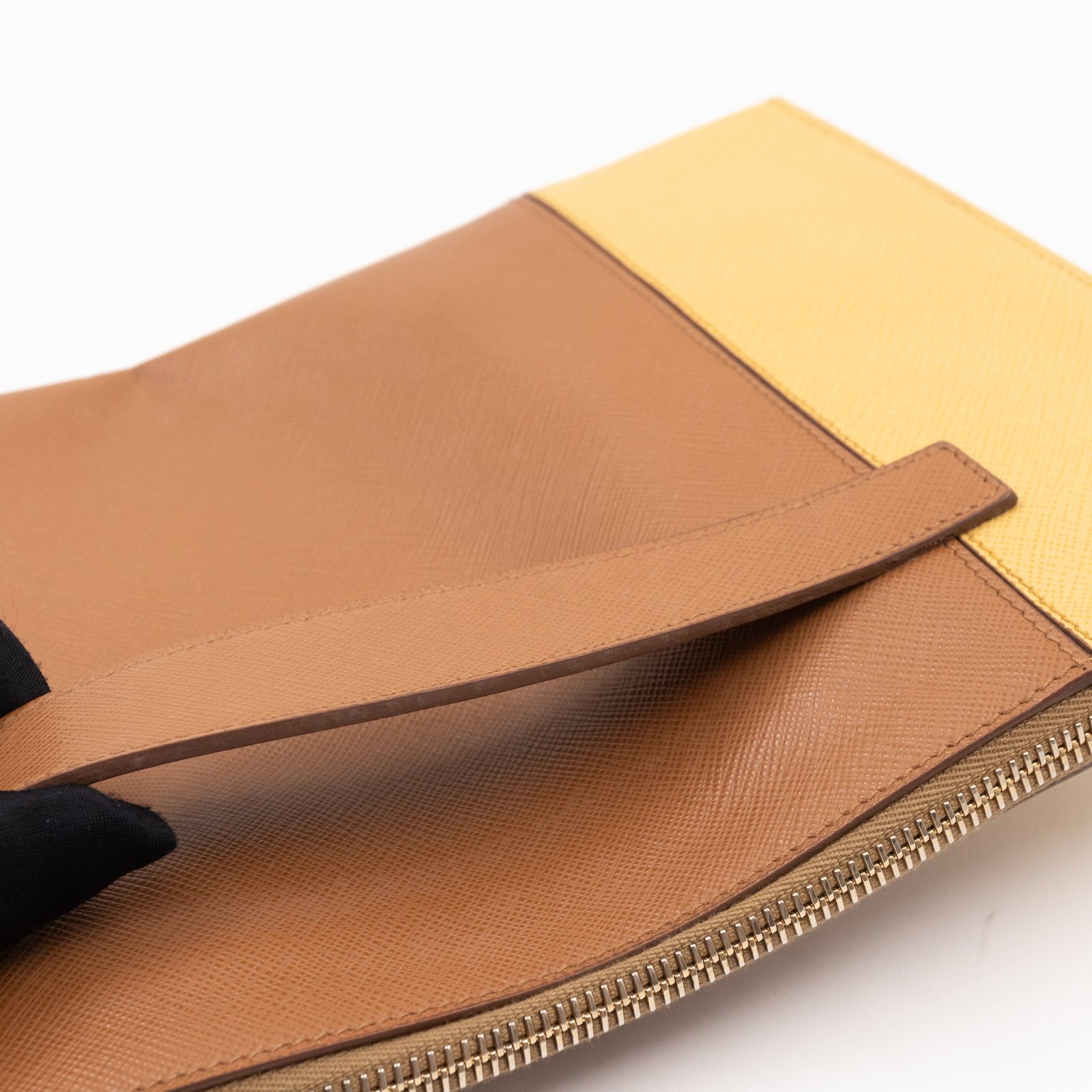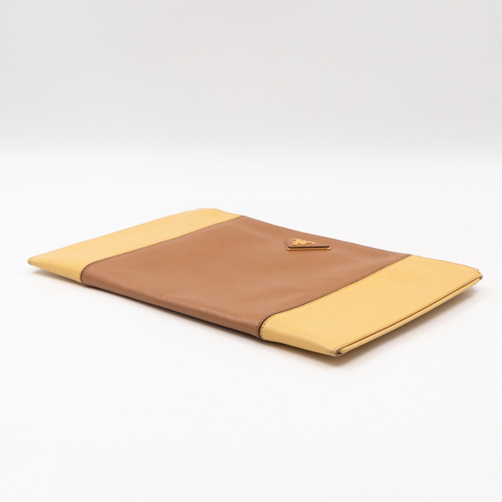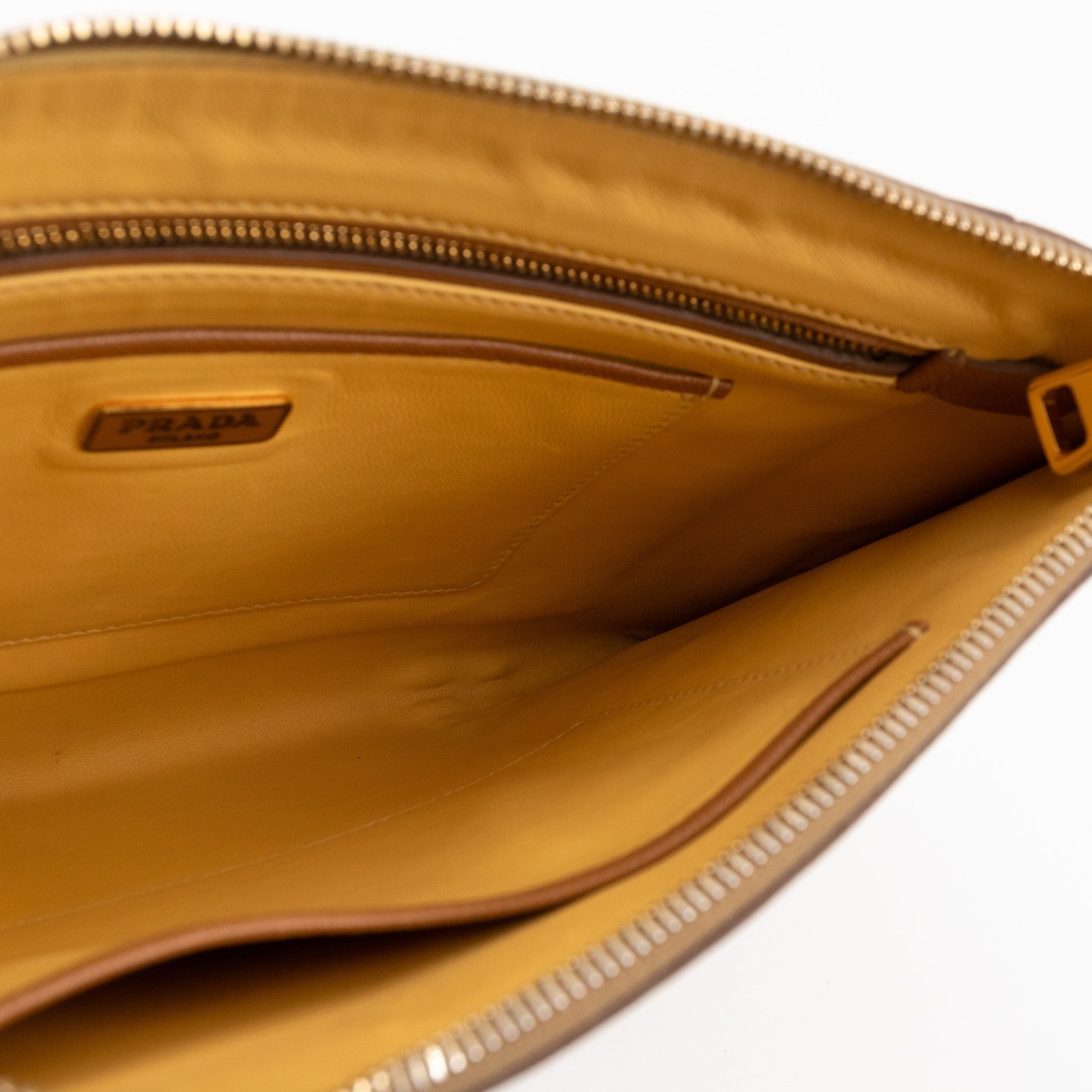 This is a zip clutch bag from Prada. It is made with saffiano leather in yellow and brown color, features a wrist strap on one side, and with a gold-tone Prada logo on the front. The interior is spacious enough with a zipper pocket. There is a handle on the back to carry it more easily. A good choice for an evening event.